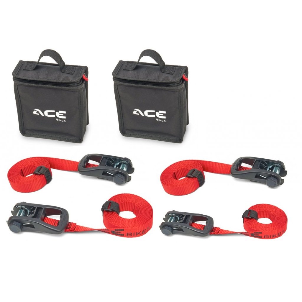 Sada je vybavena ráčnami Acebikes Premium Ratchets a integrovanými všitými poutky, které splní všechny přepravní potřeby. Díky integrovaným poutkům je snadné jej připevnit k jakémukoli závěsnému bodu motocyklu a také zabraňuje tomu, aby se měkčené háčky dotýkaly karoserie. Víceúčelové řešení pro střední až těžké motocykly nebo skútry, které je dodáváno s praktickou taškou na přenášení a popruhy na suchý zip pro pořádek zbylých popruhů.