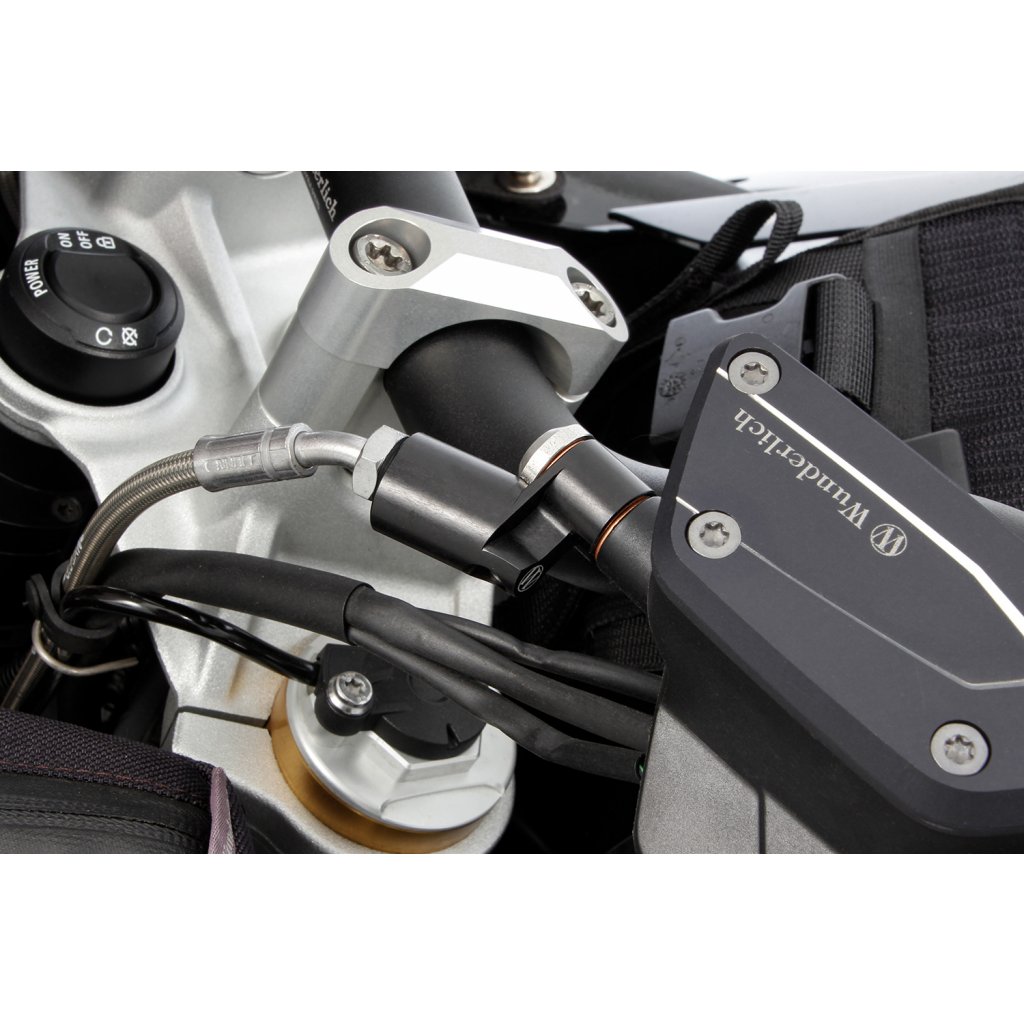 Náš vysoce kvalitní adaptér pro brzdové a spojkové vedení jej prodlouží asi o 35 mm, což je rozměr, který se osvědčil v praxi. K praktickému adaptéru připevníme potřebný banjo šroub a všechna potřebná těsnění. Montuje se přímo na příslušné brzdové čerpadlo nebo spojku. Adaptér jsme mírně naklonili, což usnadňuje připojení přívodních vedení, která lze takto pokládat a spojovat bez napětí.