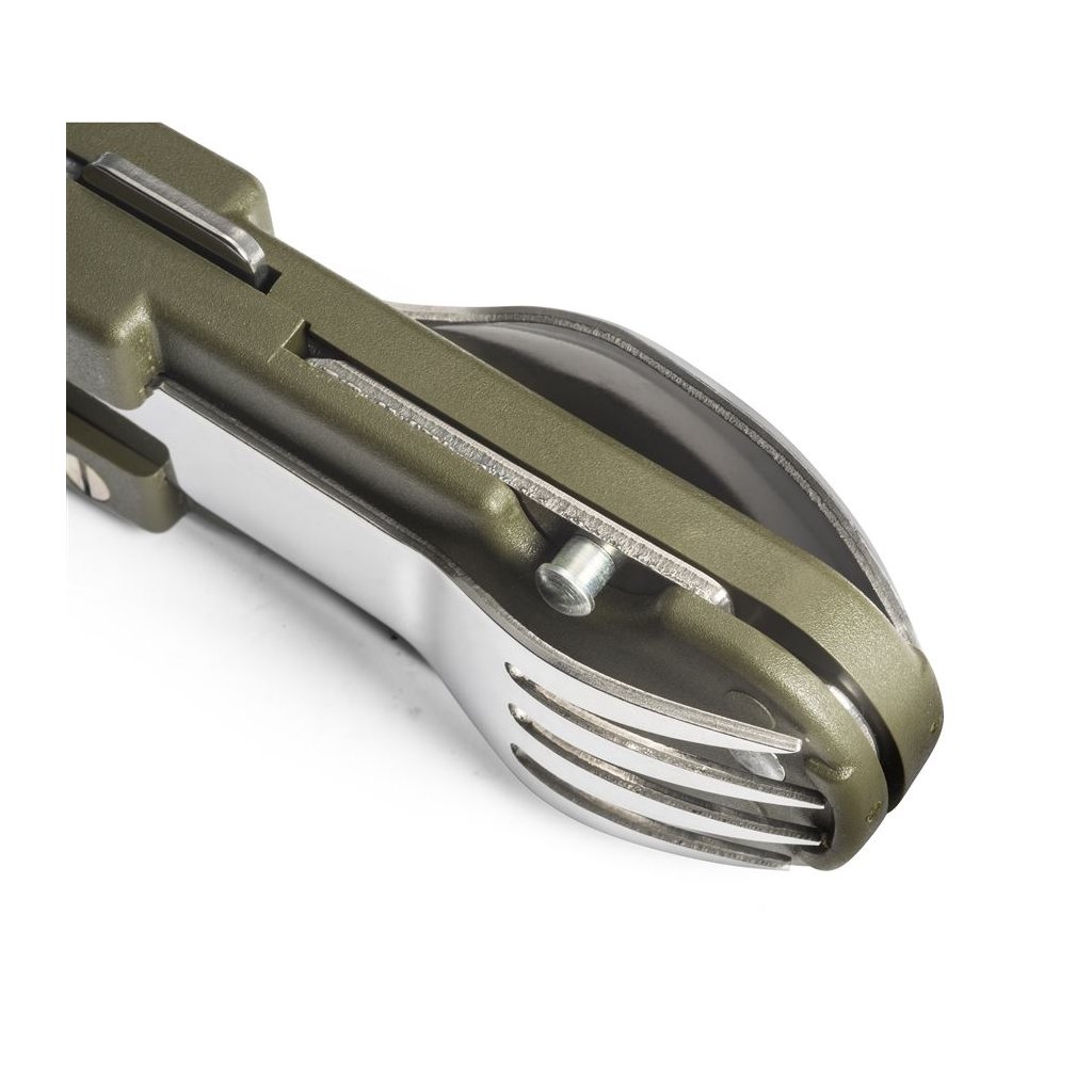 Čepel z tvrzené nerezové oceli je účinná jak u stolu, tak pro veškeré outdoorové použití. Chytrá ergonomická rukojeť z lehkého, nárazuvzdorného materiálu ABS nabízí snadný úchop a umožňuje umístit vidličku a lžíci na každou stranu nože v důmyslném systému patentovaných skluzů.
