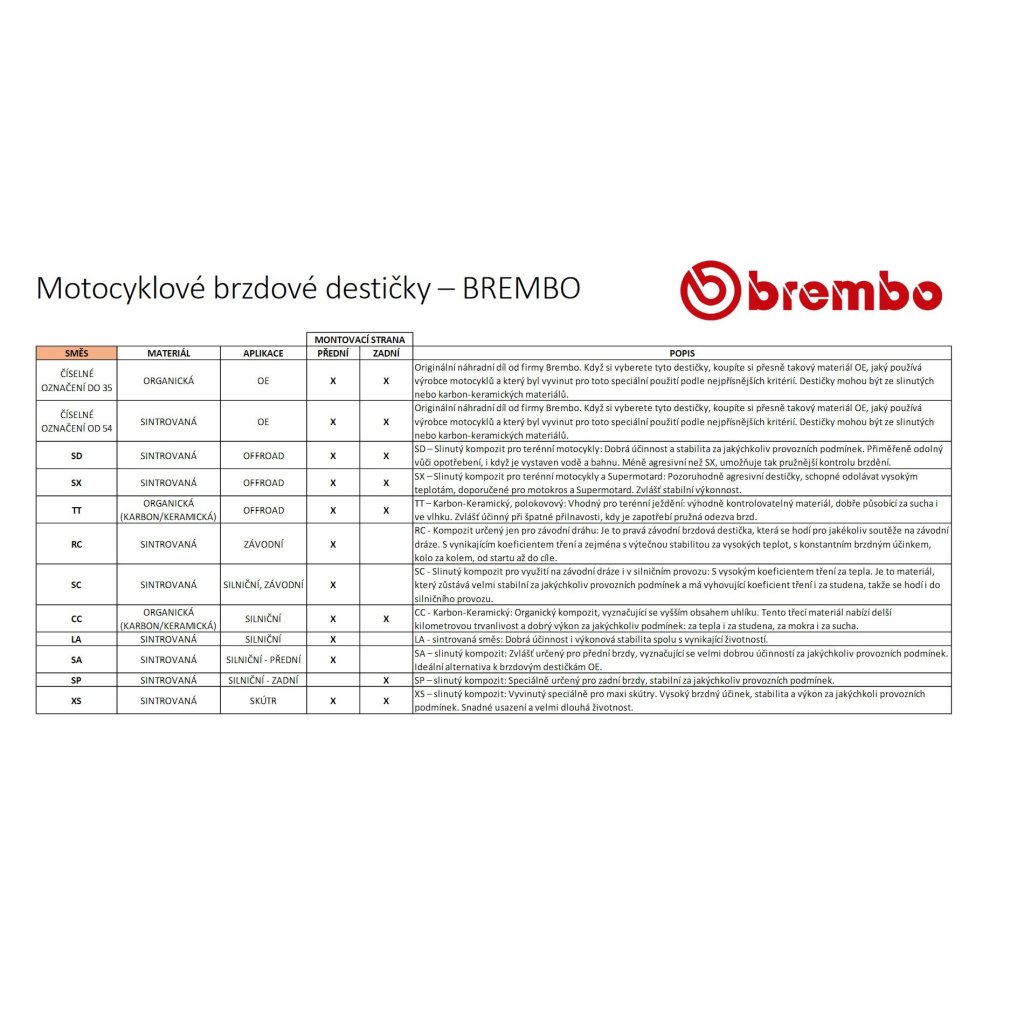 SA – slinutý kompozit, určený pro přední brzdy, vyznačující se skvělou účinností za jakýchkoliv provozních podmínek. Ideální alternativa k brzdovým destičkám OE.