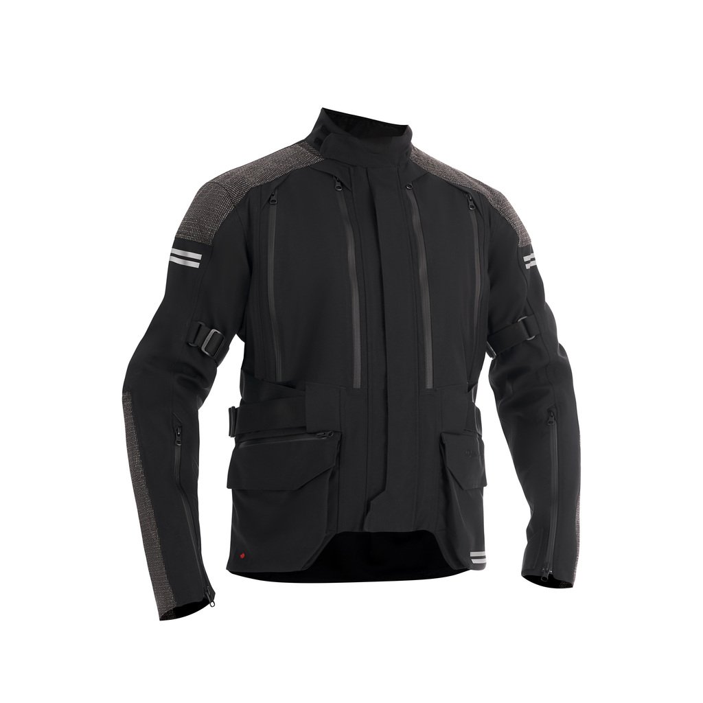 Vodě a větru odolná a prodyšná laminovaná třívrstvá textilní bunda se strečovými vlastnostmi.