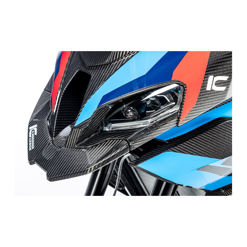 Karbon jako „materiál z letectví“ tu ukazuje svůj potenciál: oproti sériovému dílu může přinést až 70% úsporu hmotnosti a zároveň vysokou tuhost. Tvar je navržen tak, aby fungoval i vypadal – perfektně zapadne do designu motorky, navazuje na její linie a podtrhne high-tech charakter BMW s autentickým vzhledem pravého karbonu.