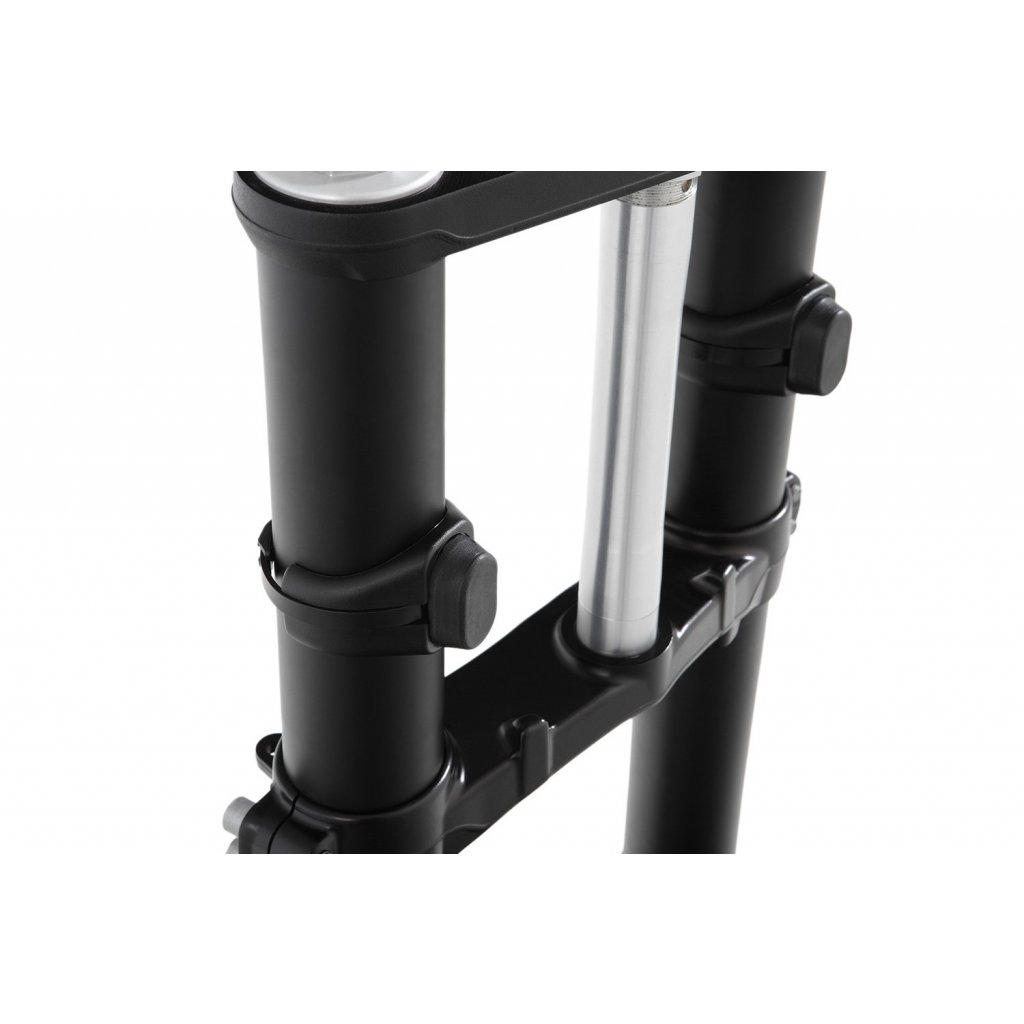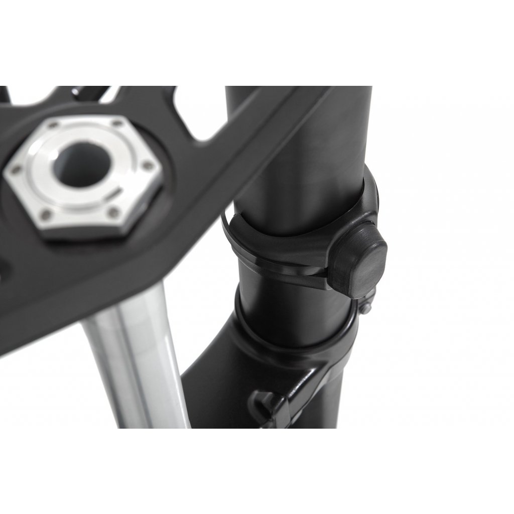 Montáž dvou omezovačů dorazu řízení je velmi snadná: Nejprve se k vidlicovým trubkám připevní skrytou vysoce kvalitní lepicí páskou 3M a poté se připevní pomocí robustního kabelového svazku, který nenápadně zapadne do k tomu určené obvodové drážky.