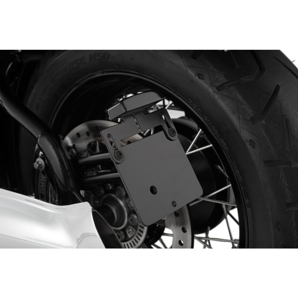 Ušlechtilý držák SPZ Wunderlich umožňuje jasný výhled na nádherné zadní kolo BMW R 18. Dovedně navržená konstrukce navíc dokonale zapadá do linie cruiseru. Aby ladil s elegantním rámem R 18, nalakovali jsme držák SPZ v černé barvě a dokončili bezbarvým lakem. Jednoduchá instalace se provádí na stávající montážní body na otočném rameni. Vedení kabelů pro osvětlení SPZ je důmyslné a neviditelné skrz trubky držáku SPZ, LED osvětlení SPZ ve vyfrézovaném pouzdře lze namontovat buď nahoře, nebo zboku.
