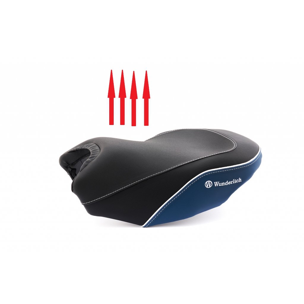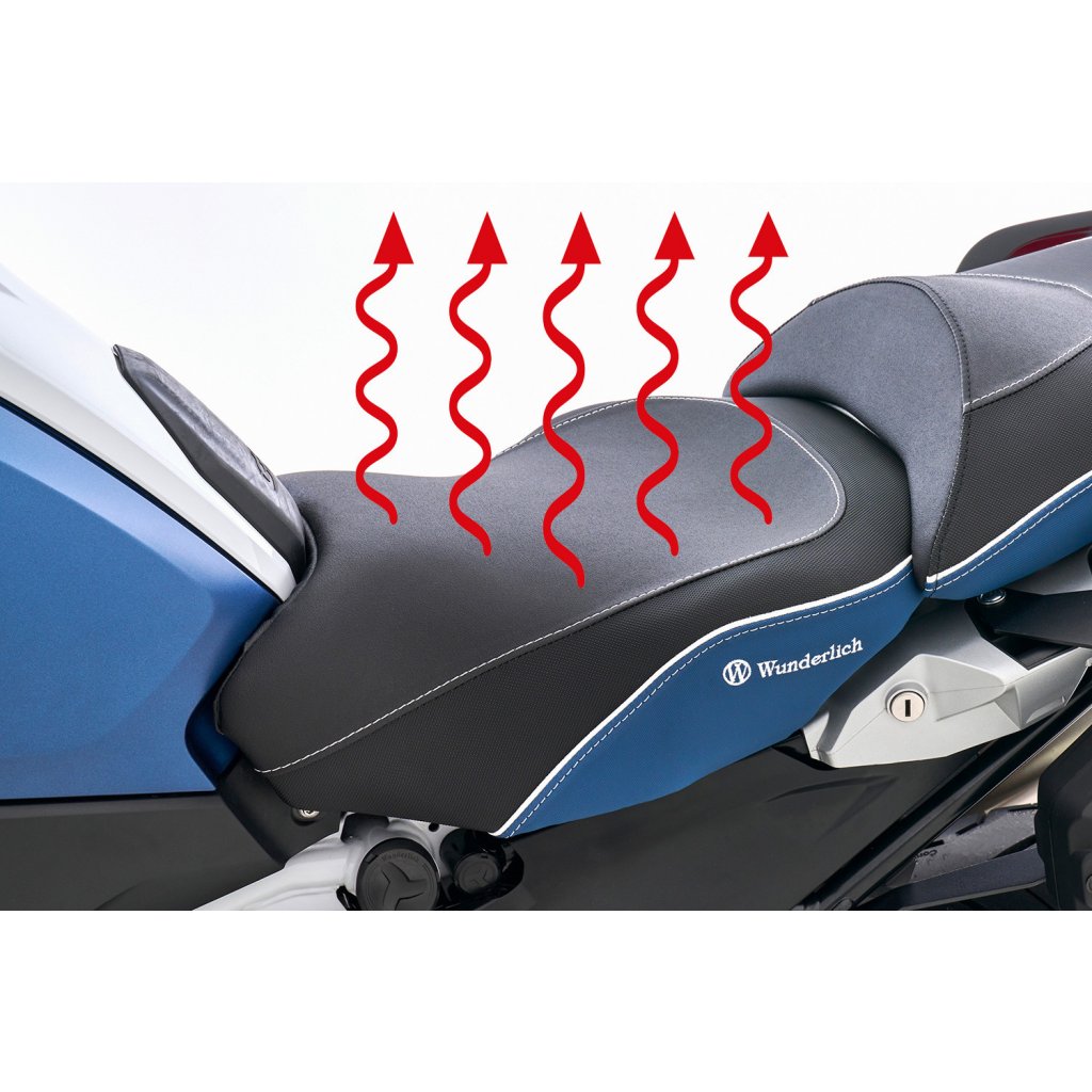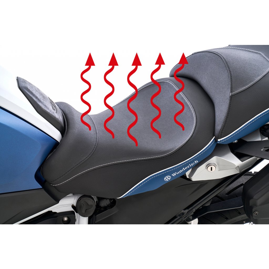 Wunderlich sedla jsou vyráběna s charakteristickým, ergonomickým 3D obrysem, který umožňuje řidiči splynout s jeho motocyklem BMW. Tvar a sklon náročně zpracovaného, progresivně konstruovaného, dvouvrstvého jádra sedla podporuje ergonomicky výhodné, a přirozené držení pánve. Takový posez je prostě uvolněný a aktivní. Není pochyb o tom, že uvolněné sezení vytváří plus v pasivní bezpečnosti. S povlakem ThermoPro je teplota sedla až o 25 °C nižší v létě na žhnoucím slunci ve srovnání s běžným, neošetřeným potahovým materiálem.