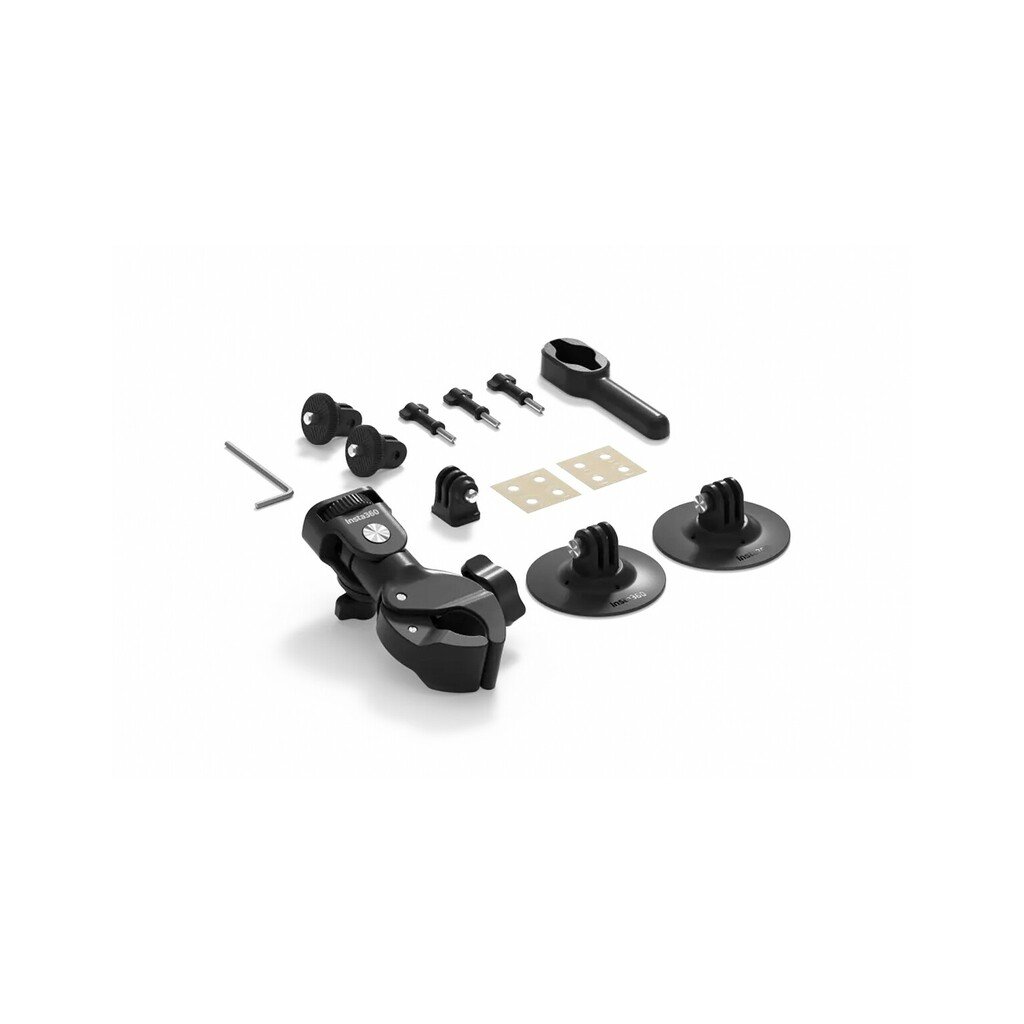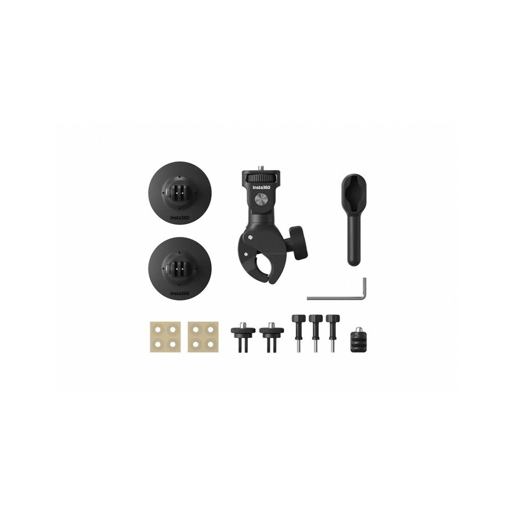 Montážní sada kamery na motorku Insta360. Obsahuje objímku na řidítka, dva samolepicí držáky na helmu, dva adaptéry se stativovým závitem, adaptér s vnitřním stativovým závitem, pojistné šrouby a plastové vložky. Součástí sady je i šestihranný klíč a utahovací nástroj.