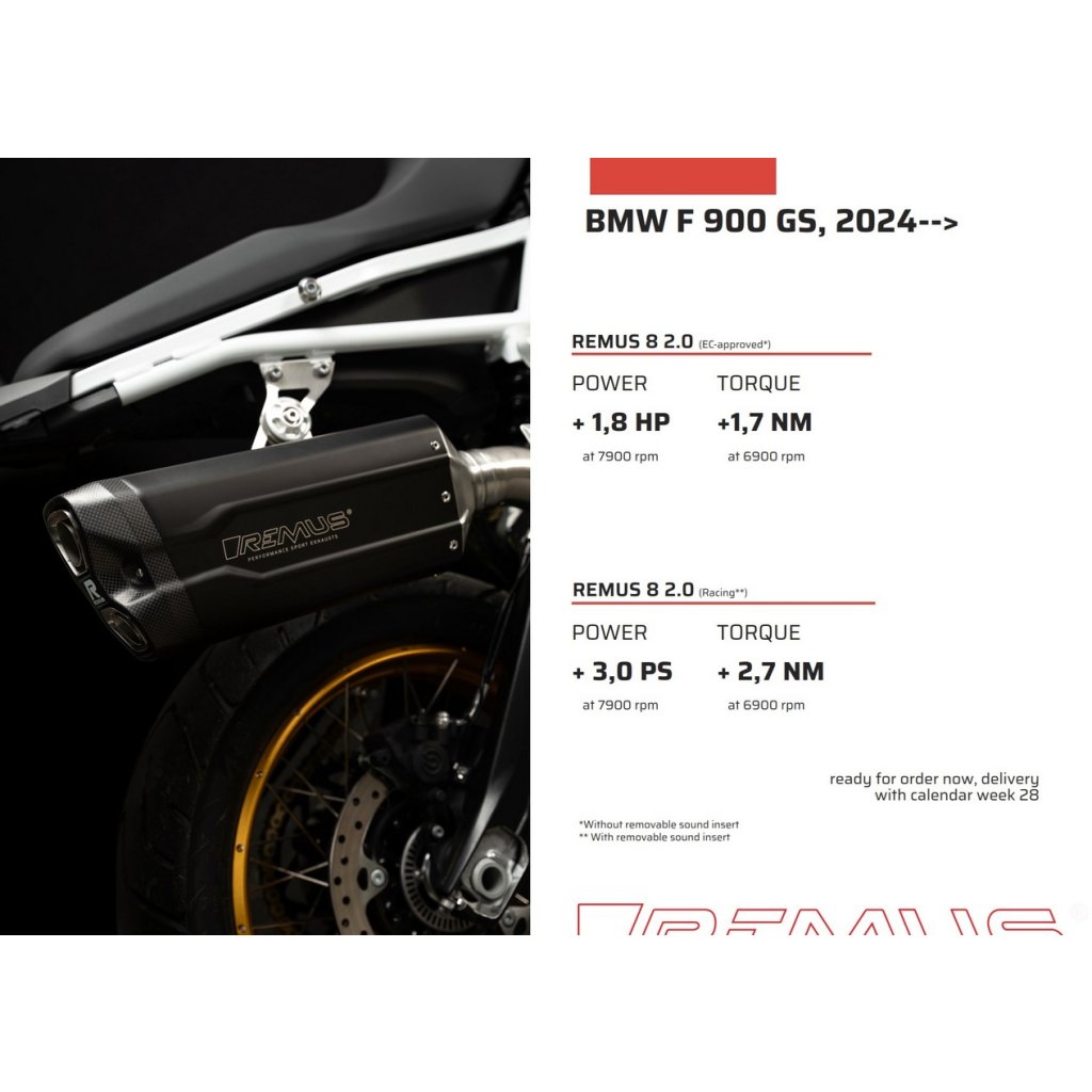 S tímto systémem vám můžeme garantovat decentní zvuk s příjemným sportovním nádechem navzdory současné EURO 5+ normě. Přesto zůstává zvukový projev plně kultivovaný a nikdy vás nebude otravovat ani na dlouhých cestách napříč Evropou. A to i pokud zavítáte do rakouských Alp, i zde můžete být zcela v klidu. Systém je plně homologovaný nejen po celé EU, ale právě i v problematických alpských úsecích. Systém byl odladěný v akustické komoře, takže skutečně garantujeme, že vás nikdy nebude zvukový projev obtěžovat. Se systémem REMUS 8 2.0 získáte technologickou špičku a díky cool designu vystoupíte z davu cestovních endur. REMUS je dnes vývojářem a dodavatelem přímo do výroby Ducati, KTM, AMG, Aston Martin, BMW, Lamborghini, Maserati nebo Porsche, takže si opravdu můžete být jisti technologicky tím nejlepším produktem. POZOR - spolu s tlumičem je nutné zakoupit i spojovací trubku. Systémy REMUS lze žádat i u vybraných BMW dealerů.
