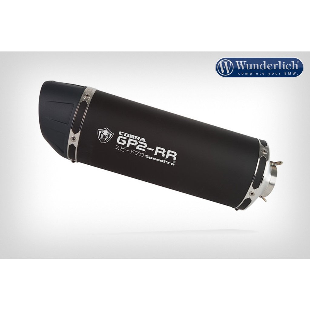 Systém SPEEDPRO COBRA GP2-RR Black Series se skládá z tlumiče, středové trubky a montážního materiálu. Systém je vyroben z hliníku a kartáčované matné černé barvy s EG-ABE.