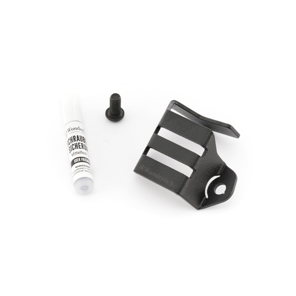 Diskrétně integrovaný ochranný kryt chrání zásobník brzdové kapaliny zadní brzdy před mechanickým poškozením a snižuje nebezpečí například v případě pádu nebo uvíznutí v terénu. Dokonce i nedbalost při lezení může stačit k poškození nebo dokonce odtržení nádrže, která je připevněna pouze šroubem. Horší než zjevné poškození je však nepovšimnuté poškození, které může vést ke ztrátě brzdové kapaliny a v nejhorším případě k neočekávanému selhání brzd. Chrání před tím i náš pevný kryt, který vyrábíme z 2 mm silného hliníkového plechu a který chrání nádobu po celém obvodu. Kompaktní, trojrozměrná konstrukce dále zvyšuje tuhost a odolnost komponent. Šikmé prohlubně slouží nejen dynamickému designu krytu, ale mají také funkci. Díky tomu je snadno čitelná hladina brzdové kapaliny navzdory namontovanému ochrannému krytu. Horní kryt snižuje riziko neúmyslné manipulace s brzdovým systémem tím, že ztěžuje odšroubování krytu zásobníku. S logem značky Wunderlich.