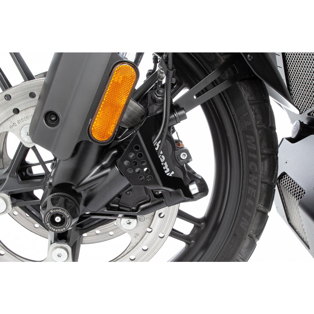S naším krytem na míru spolehlivě chráníme regulační ventil a snižujeme riziko poškození kameny, větvemi nebo jinými cizími tělesy, protože porucha může mít nepříjemné následky. Ochranný kryt má pevnou tloušťku materiálu 2,5 mm. Trojrozměrný tvar a přesné lemování vysoce kvalitního krytu z nerezové oceli přispívají k tuhosti konstrukčních prvků. Perforace zvýrazňuje dobrodružný vzhled a snižuje hmotnost krytu. Je přišroubován se snadno přístupným levým předním brzdovým třmenem, aby byl tvarově přizpůsoben - který také chrání - a je tímto způsobem jemně integrován.
