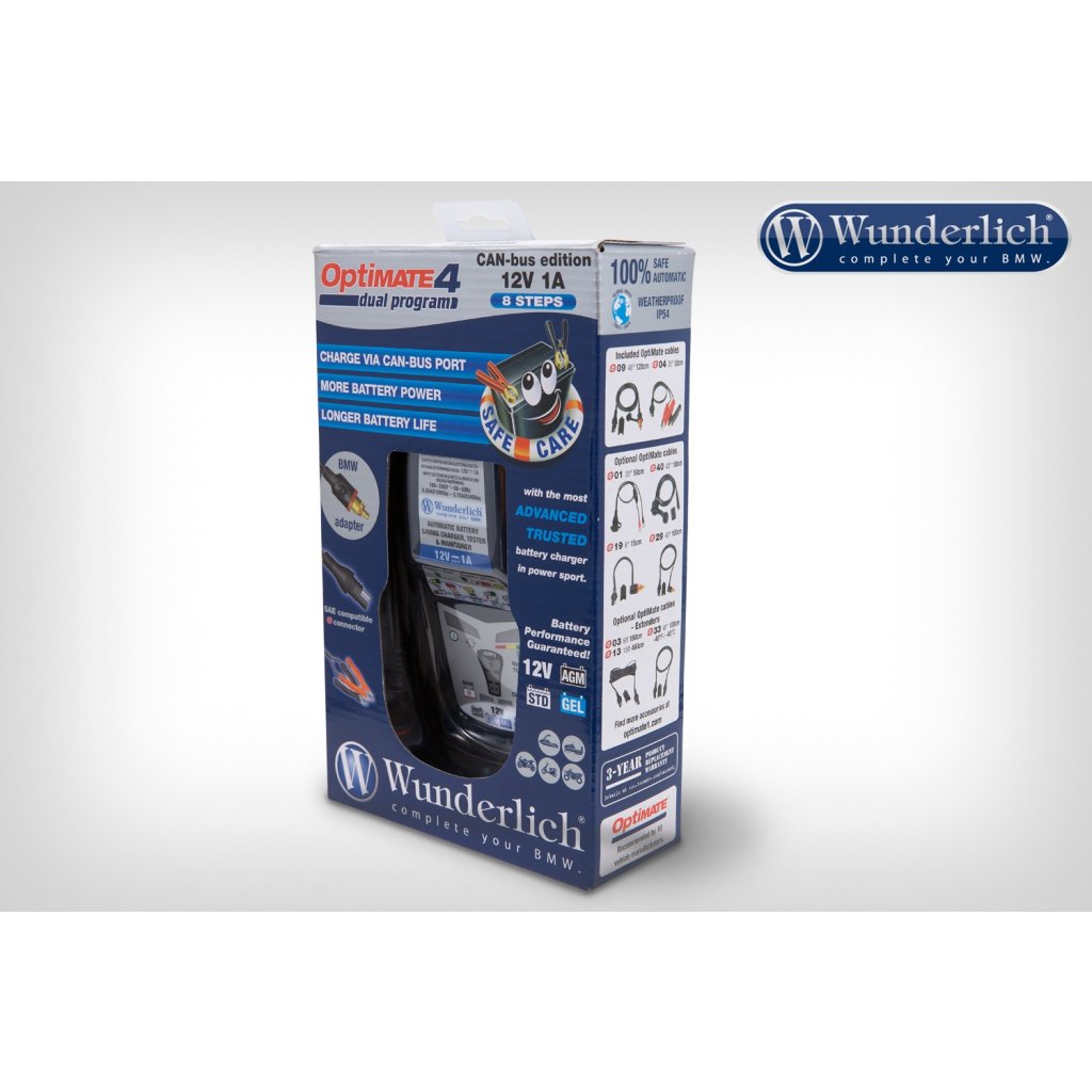 Automatická nabíječka OptiMate 4 DUAL Program 12V 0,8A. Je navržena pro propojení na všechny originální zásuvky 12V BMW modelů, včetně těch, které jsou vybaveny systémem CAN-bus (sběrnice CAN). Nová verze "DUAL PROGRAM" umožňuje v módu CAN-bus propojení přes zásuvku BMW 12V, a zbavuje tak uživatele nutnosti vůbec něco montovat. Není ani nutné jako u všech konkurenčních nabíječů aktivovat zapalování. Nabíječka slouží pro nabíjení všech běžných (olověných, bezúdržbových i gelových) motocyklových baterií o kapacitě 2Ah až 50Ah. Nabíječka není určena jen pro servisy, ale i pro běžného uživatele, který si potrpí na prvotřídní kvalitu a pohodlí. Optimate 4 dokáže nejen baterii nabít, ale i oživit hluboko vybité akumulátory, otestovat stav baterie a udržovat ji trvale v nabitém stavu. Optimate 4 DUAL může být trvale připojen k akumulátoru.