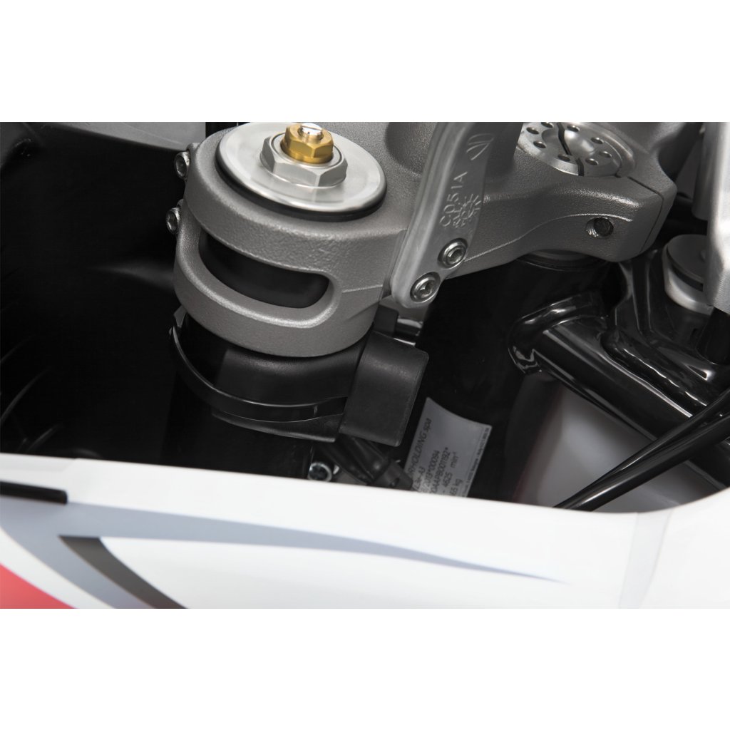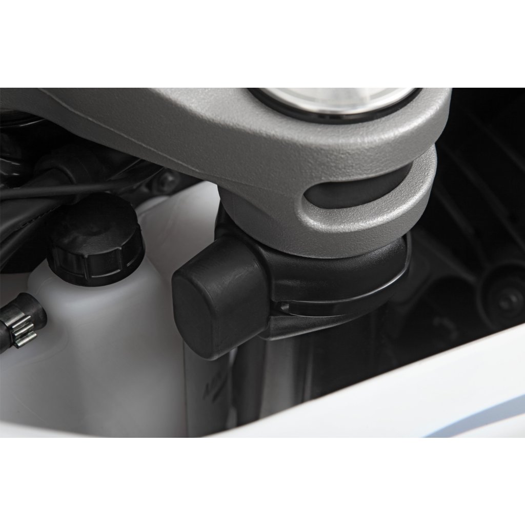Originální dorazy řízení, rám a nádrž jsou spolehlivě chráněny našimi omezovači, které se opírají o vhodnou a stabilní část rámu při maximálním uzamčení řízení, čímž se snižuje riziko poškození. Pokud vaše kolo někdy spadne nebo se stane účastníkem havárie, omezují a tlumí úhel natočení volantu svými velkými gumovými bloky dříve, než silné síly dosáhnou standardních zastávek řízení. Materiálové charakteristiky omezovačů byly zvoleny tak, aby tlumení zastavení bylo zpočátku měkké a pak se postupně zvětšovalo s tím, jak je aplikována větší aretace řízení. Absorbují energii nárazu, chrání původní zarážky řízení a snižují riziko ohnutí nebo dokonce odtržení standardních zarážek řízení. Pokud se někdy stanete účastníkem nehody, omezovače samozřejmě také vytvářejí prostor pro vaše ruce a dolní paže, čímž se snižuje riziko jejich uvíznutí.