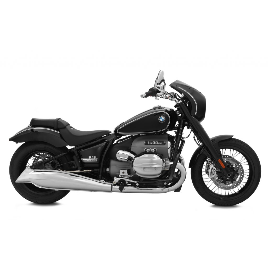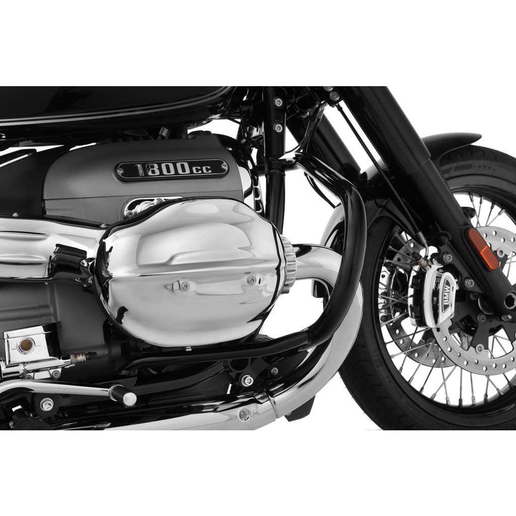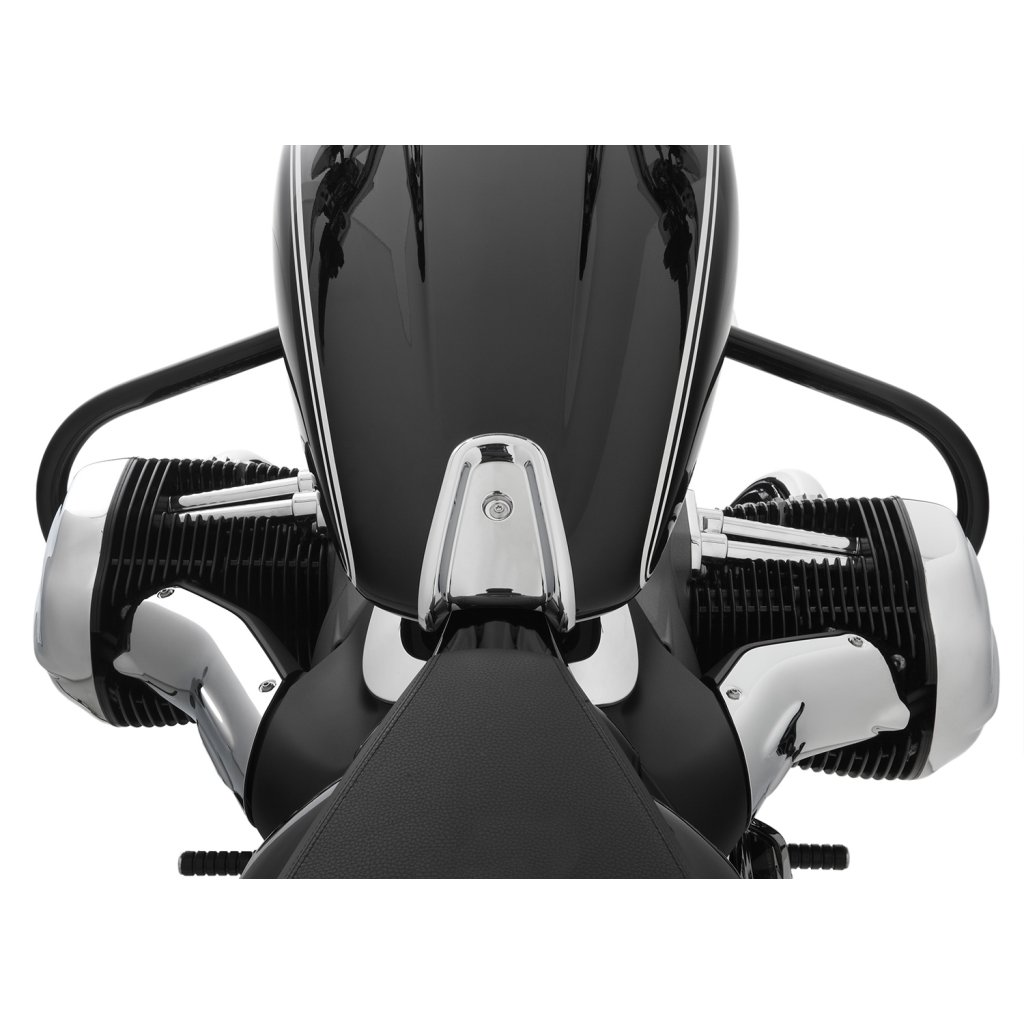 Pro tento rozměr trubky jsme se rozhodli ze dvou důvodů: Z důvodu pevnosti, abychom optimálně chránili R 18, a z estetických důvodů. Protože pouze 32 mm trubka vypadá vyváženě a esteticky na impozantním R 18 - a kolem mocných svodových trubek. Kromě toho jsme se záměrně rozhodli pro uzavřený jednodílný tvar ochranné lišty, který kromě dimenzování přispívá k další konstrukční tuhosti. Vysoce kvalitní pochromovaný rám diskrétně zapadá do celkového stylu modelu R 18 a stále má svůj vlastní koordinovaný přízvuk. Není náhoda, že tvar rámu připomíná původní rámy klasických vzduchem chlazených boxerů BMW.