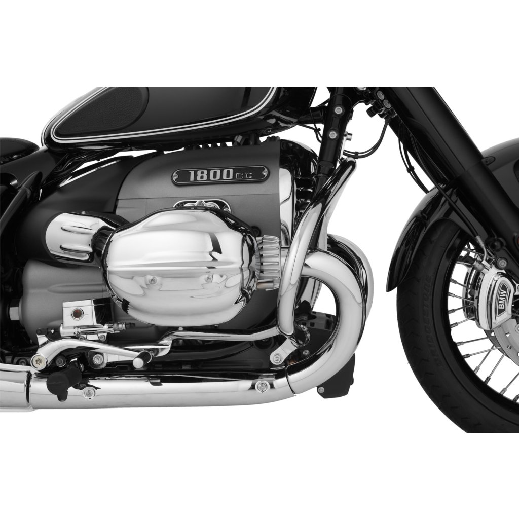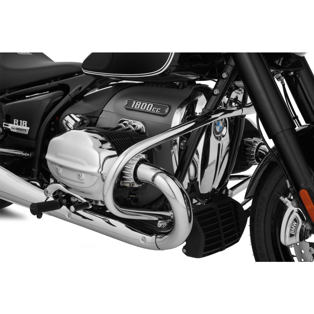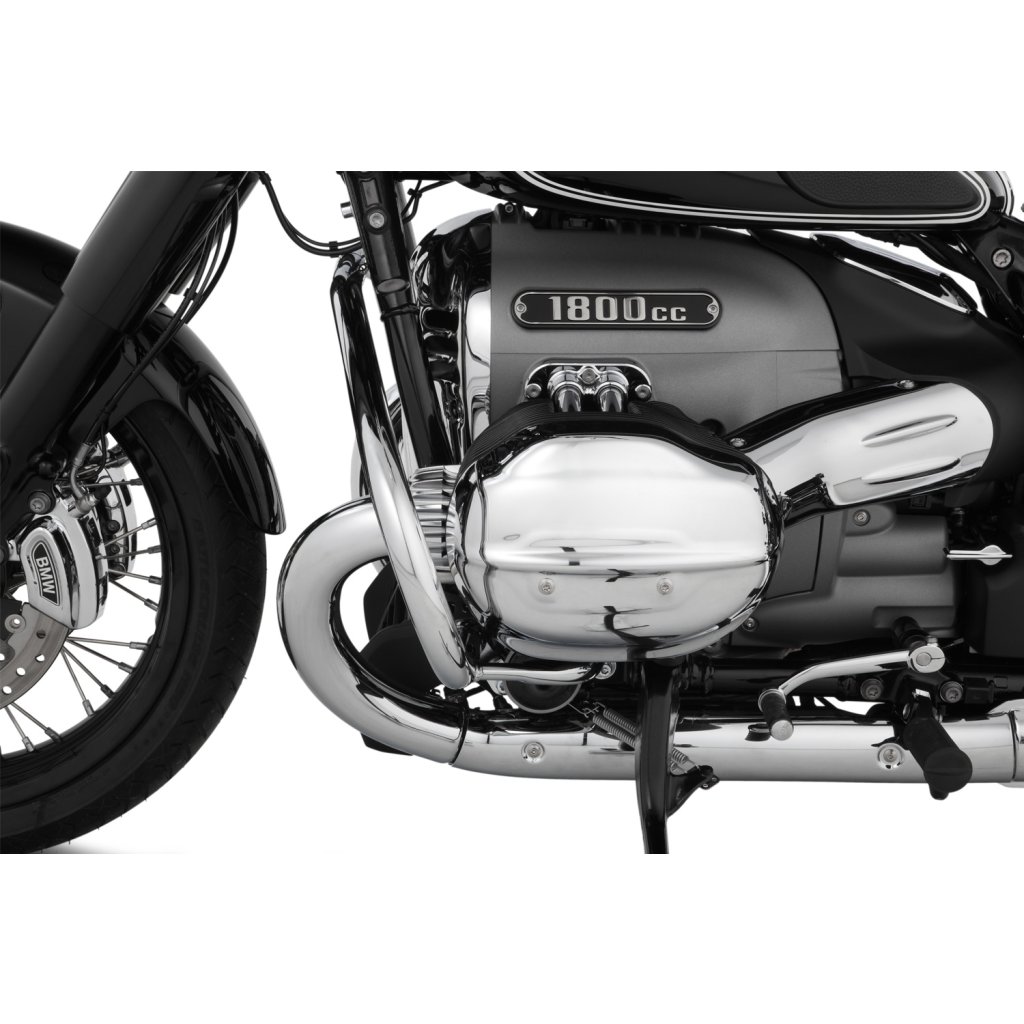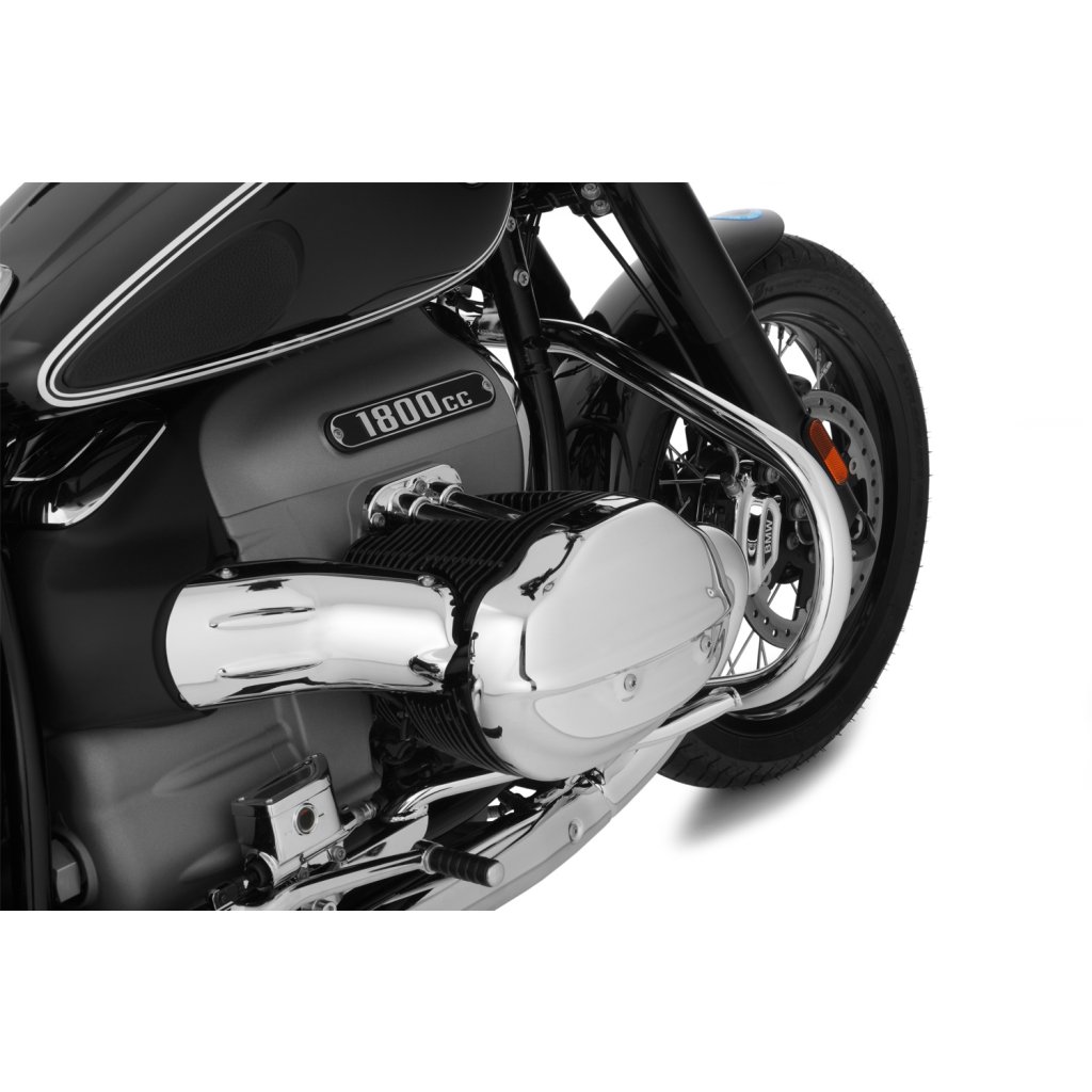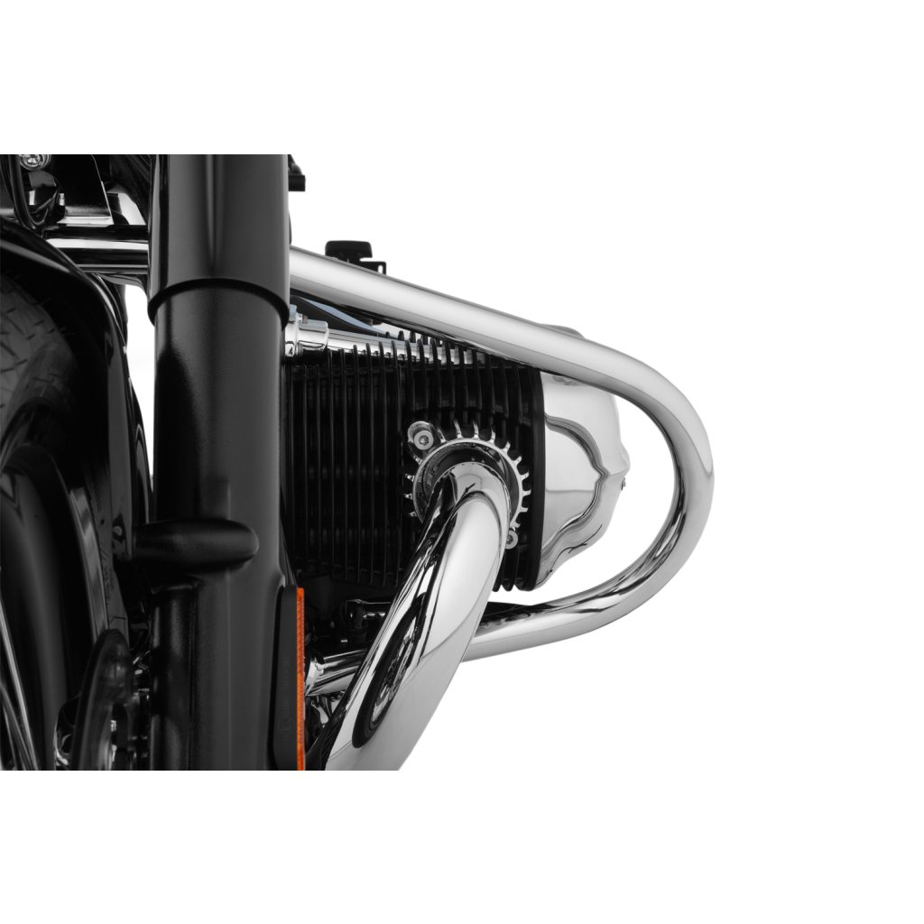 Pro tento rozměr trubky jsme se rozhodli ze dvou důvodů: Z důvodu pevnosti, abychom optimálně chránili R 18, a z estetických důvodů. Protože pouze 32 mm trubka vypadá vyváženě a esteticky na impozantním R 18 - a kolem mocných svodových trubek. Kromě toho jsme se záměrně rozhodli pro uzavřený jednodílný tvar ochranné lišty, který kromě dimenzování přispívá k další konstrukční tuhosti. Vysoce kvalitní pochromovaný rám diskrétně zapadá do celkového stylu modelu R 18 a stále má svůj vlastní koordinovaný přízvuk. Není náhoda, že tvar rámu připomíná původní rámy klasických vzduchem chlazených boxerů BMW.