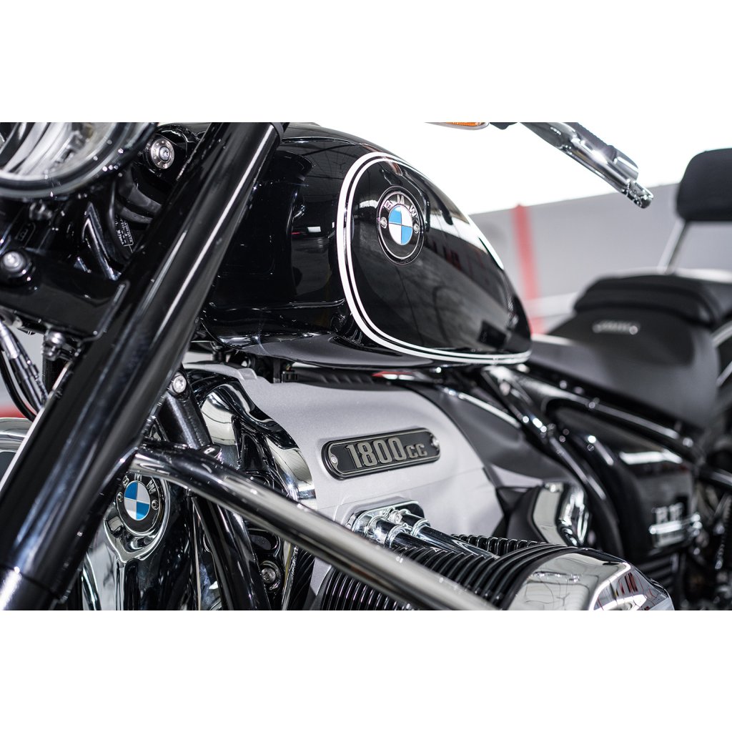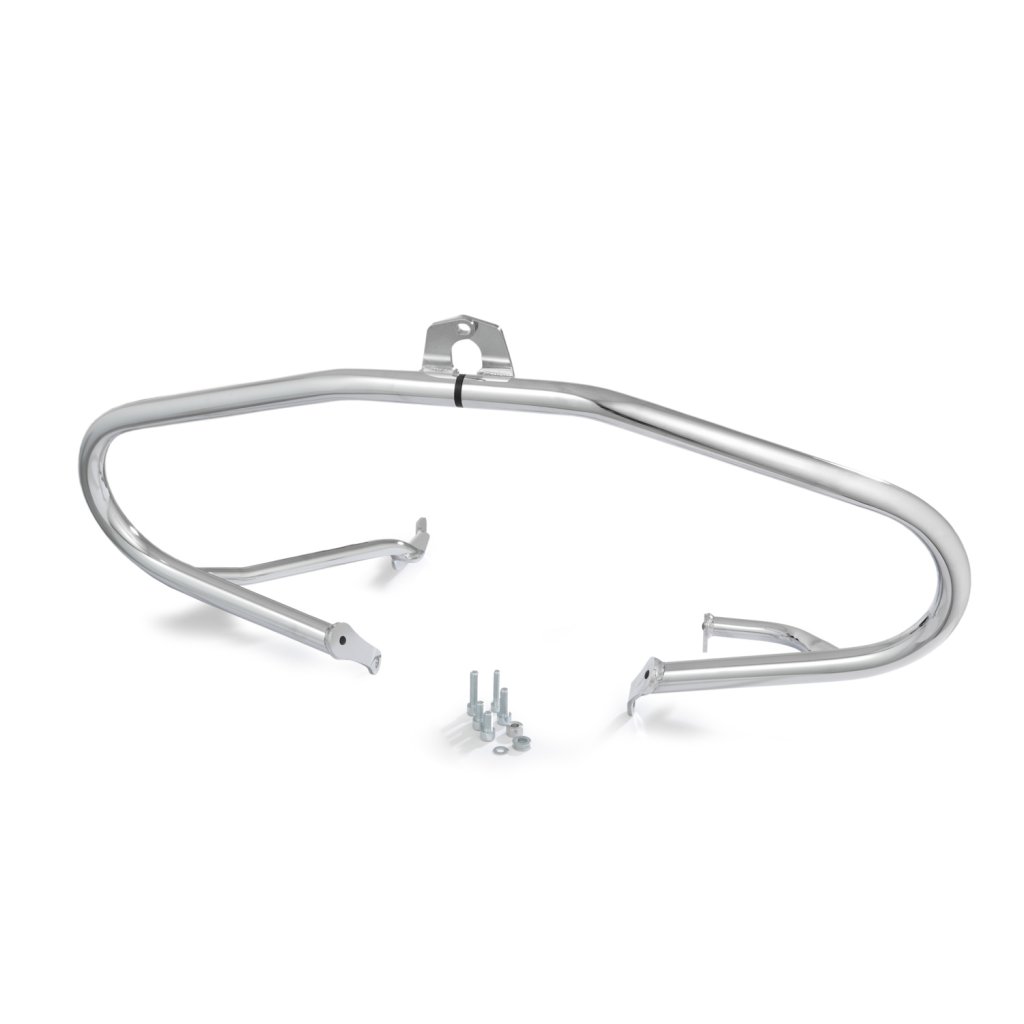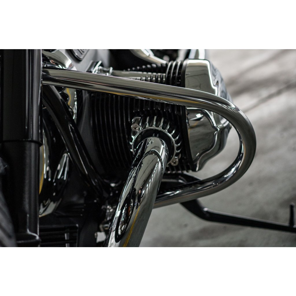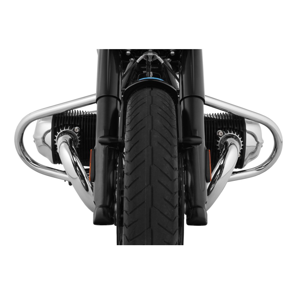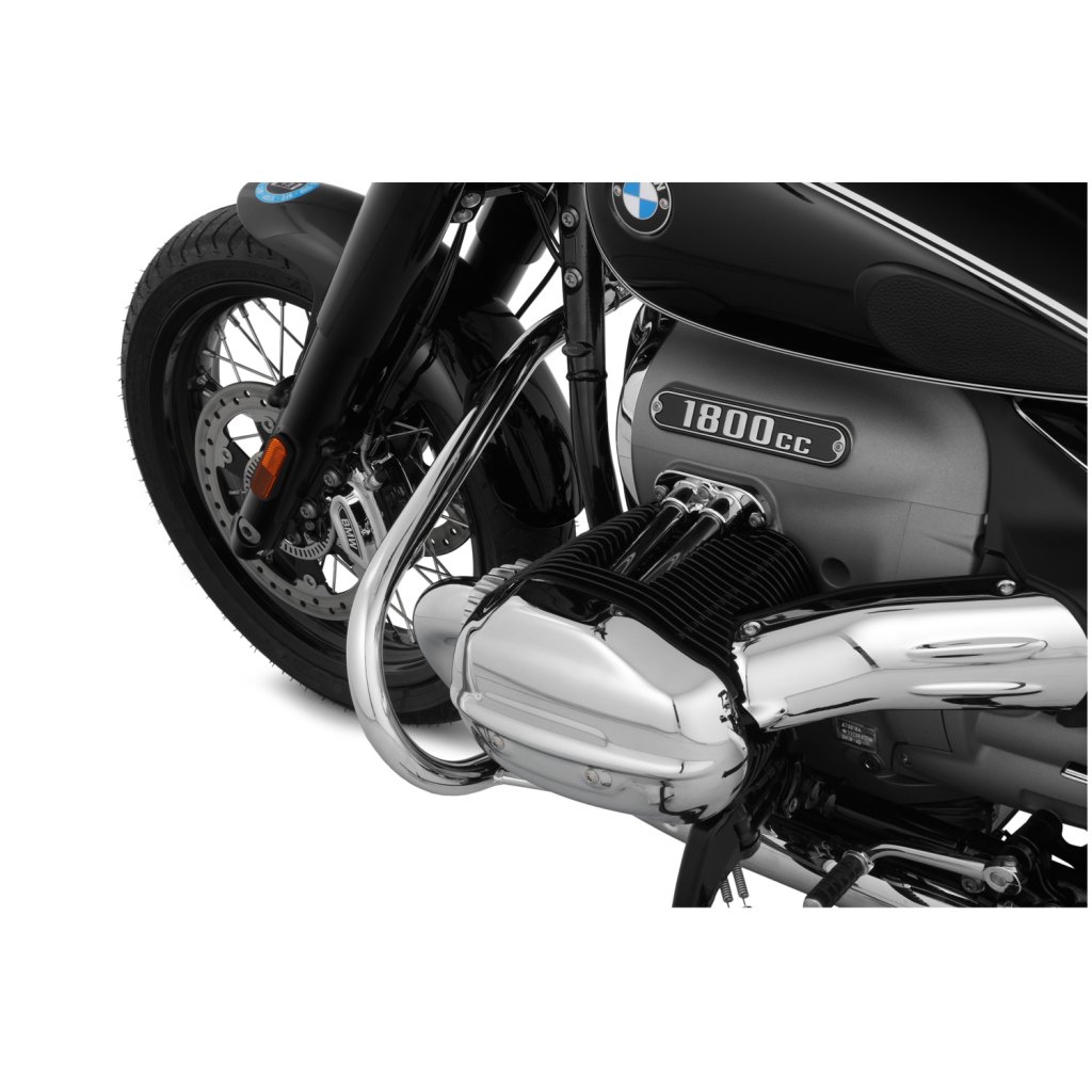 Pro tento rozměr trubky jsme se rozhodli ze dvou důvodů: Z důvodu pevnosti, abychom optimálně chránili R 18, a z estetických důvodů. Protože pouze 32 mm trubka vypadá vyváženě a esteticky na impozantním R 18 - a kolem mocných svodových trubek. Kromě toho jsme se záměrně rozhodli pro uzavřený jednodílný tvar ochranné lišty, který kromě dimenzování přispívá k další konstrukční tuhosti. Vysoce kvalitní pochromovaný rám diskrétně zapadá do celkového stylu modelu R 18 a stále má svůj vlastní koordinovaný přízvuk. Není náhoda, že tvar rámu připomíná původní rámy klasických vzduchem chlazených boxerů BMW.