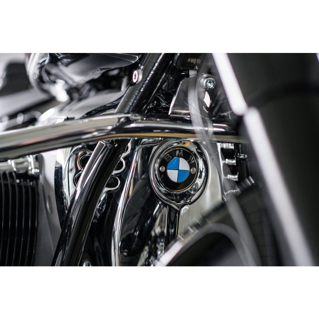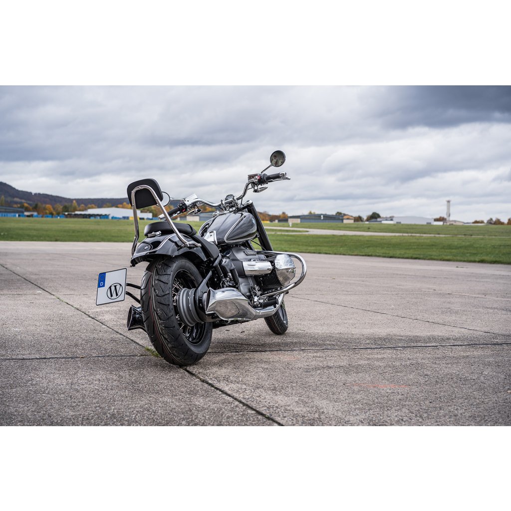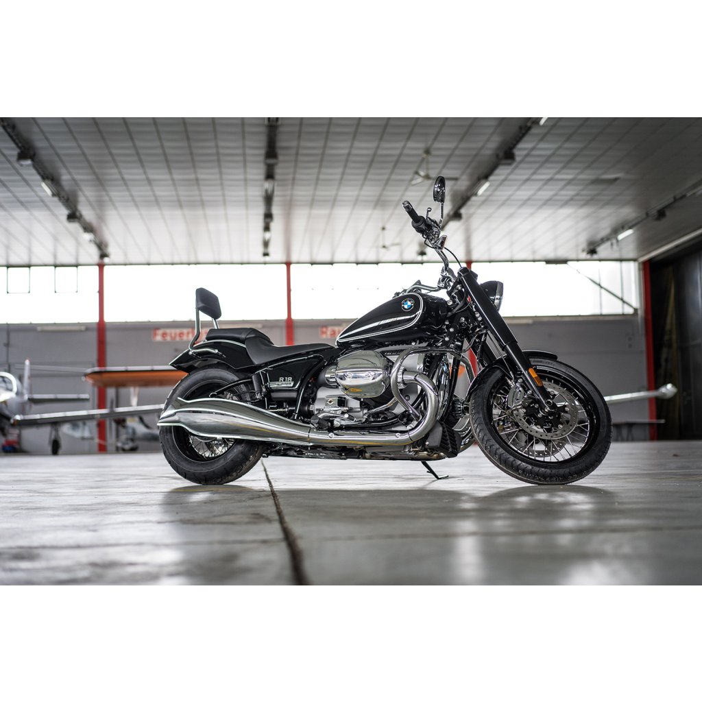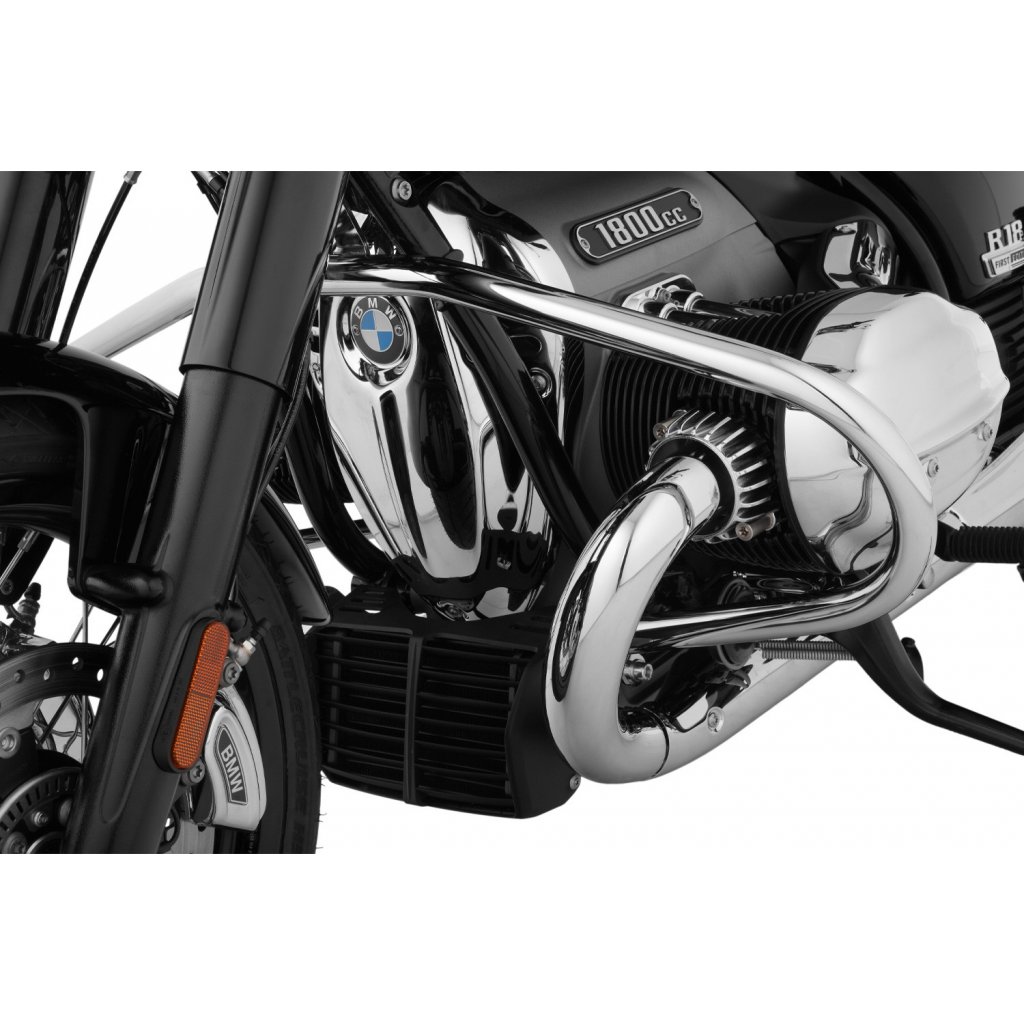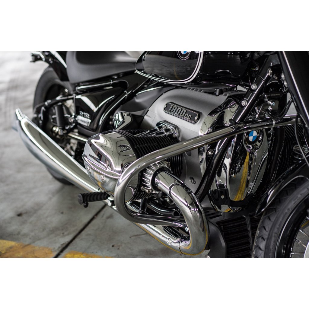 Pro tento rozměr trubky jsme se rozhodli ze dvou důvodů: Z důvodu pevnosti, abychom optimálně chránili R 18, a z estetických důvodů. Protože pouze 32 mm trubka vypadá vyváženě a esteticky na impozantním R 18 - a kolem mocných svodových trubek. Kromě toho jsme se záměrně rozhodli pro uzavřený jednodílný tvar ochranné lišty, který kromě dimenzování přispívá k další konstrukční tuhosti. Vysoce kvalitní pochromovaný rám diskrétně zapadá do celkového stylu modelu R 18 a stále má svůj vlastní koordinovaný přízvuk. Není náhoda, že tvar rámu připomíná původní rámy klasických vzduchem chlazených boxerů BMW.