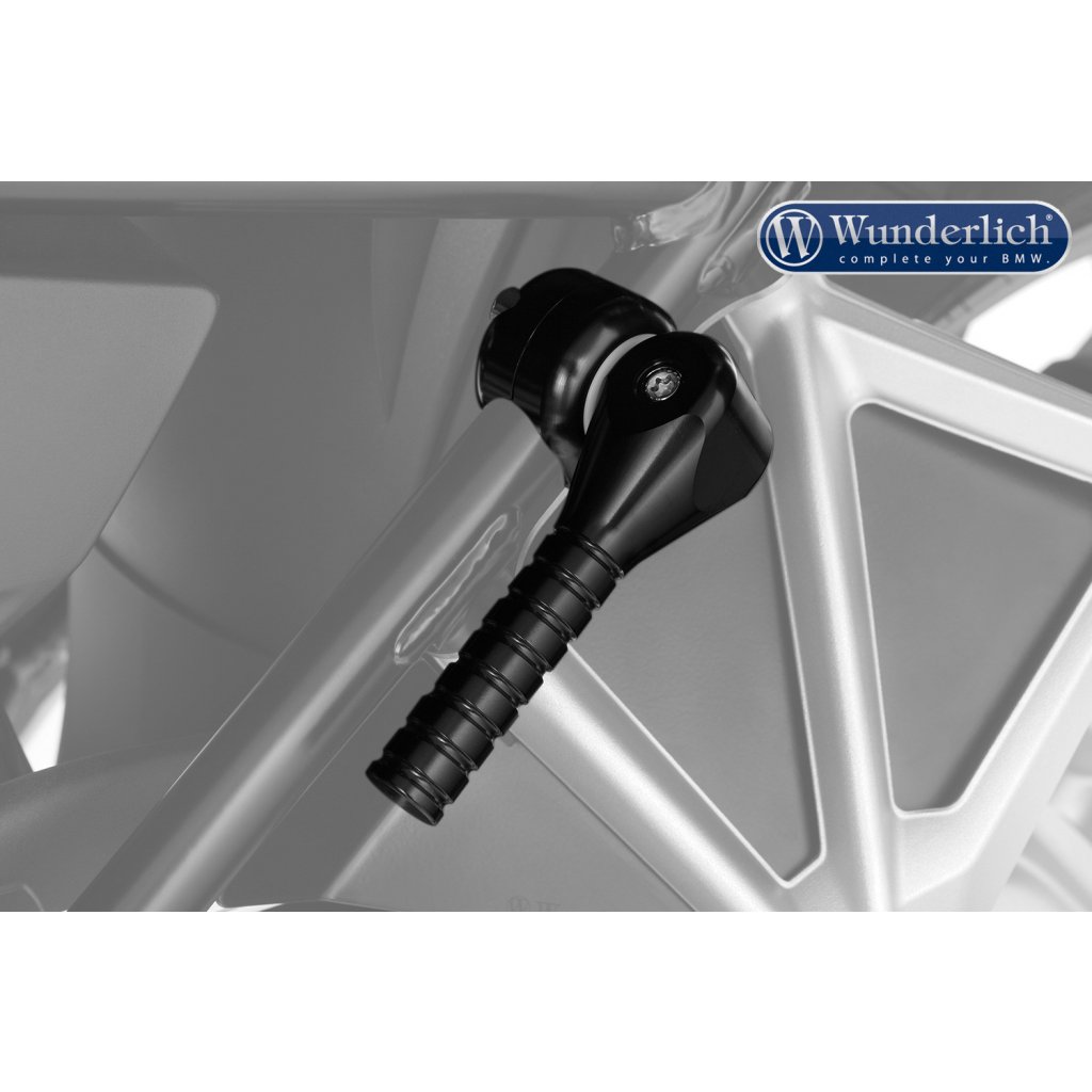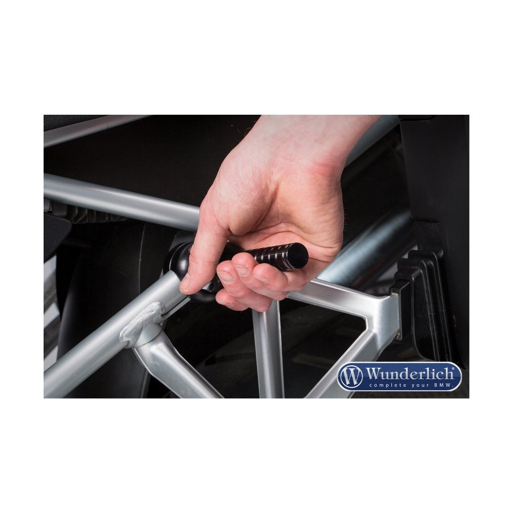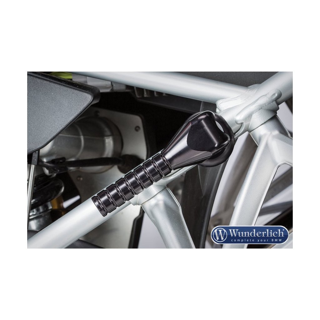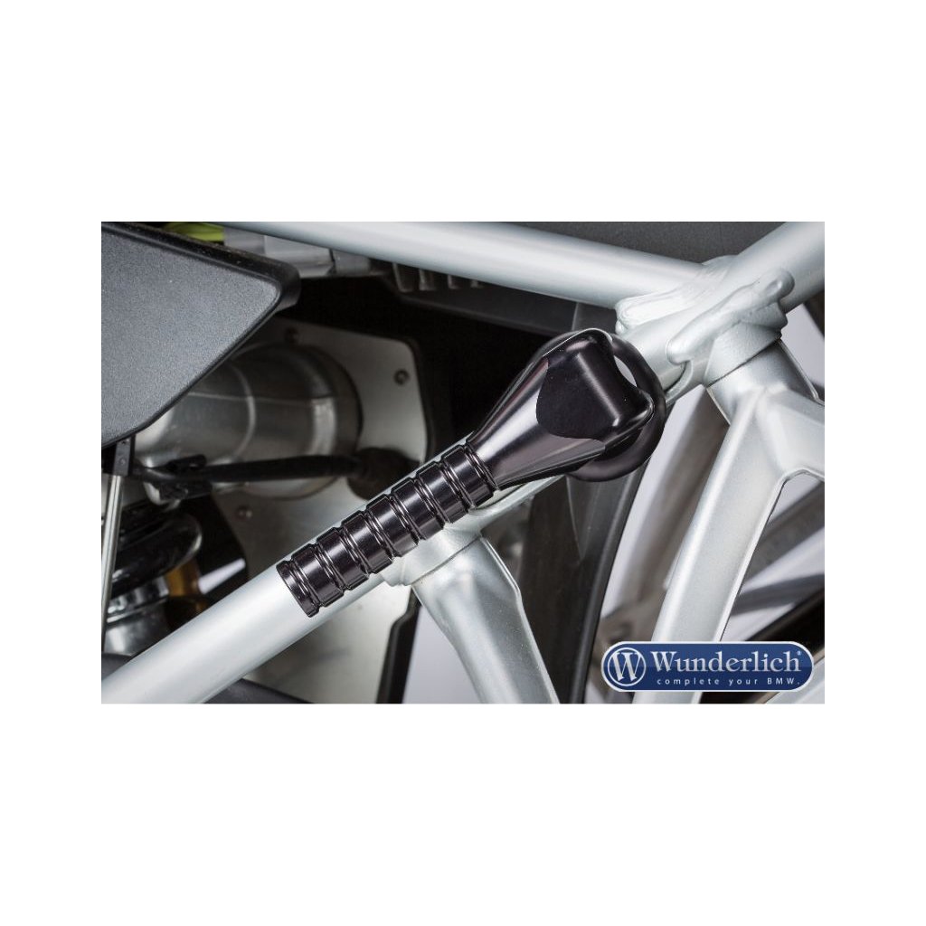 Zvednout GS na hlavní stojan není snadné, protože páka není úplně příznivá. Tato sklopná rukojeť pro zvedání, výrazně usnadňuje zvedání plně naloženého GS.
