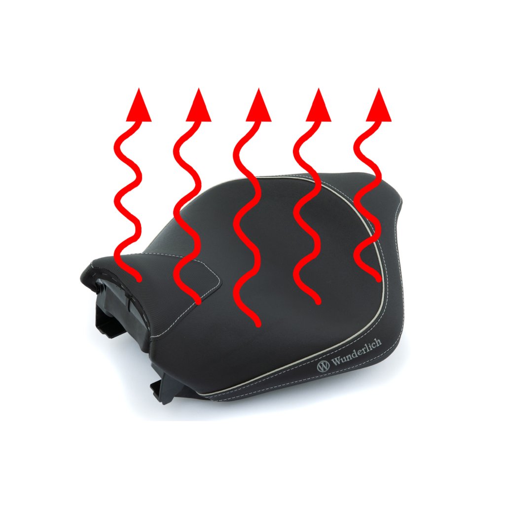 Wunderlich sedla jsou vyráběna s charakteristickým, ergonomickým 3D obrysem, který umožňuje řidiči splynout s jeho motocyklem BMW. Tvar a sklon náročně zpracovaného, progresivně konstruovaného, dvouvrstvého jádra sedla podporuje ergonomicky výhodné, a přirozené držení pánve. Takový posez je prostě uvolněný a aktivní. Není pochyb o tom, že uvolněné sezení vytváří plus v pasivní bezpečnosti. S povlakem ThermoPro je teplota sedla až o 25 °C nižší v létě na žhnoucím slunci ve srovnání s běžným, neošetřeným potahovým materiálem.
