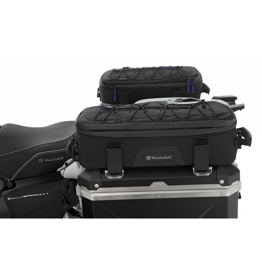 Přídavné horní tašky na kufry BagPacker II, které poznáte podle nového, aerodynamického, funkčního designu s jemnými modrými aplikacemi, najdou místo na bočních pouzdrech. Velkorysý objem 14 litrů lze pomocí výsuvu rozšířit o dalších 9 litrů až na 23 litrů. Dá se toho docílit pomocí obvodového zipu. To z nich dělá ideální společníky na dlouhé cesty. Jsou vyrobeny na zakázku a vybaveny pohodlným a stejně bezpečným upevňovacím systémem. To umožňuje montáž na kufry, které jsou vybaveny oky, jako je náš kufr »EXTREME«, originální hliníkové kufry BMW a na naše osvědčené držáky na zavazadla pro originální plastové kufry BMW Vario, které jsme vyvinuli speciálně pro modely GS . Díky připevněným páskům na suchý zip lze vaky na pouzdro připevnit i na pouzdra bez poutacích ok. Spodní strany jsou šetrné k laku a nekloužou, takže nedochází k odírání.