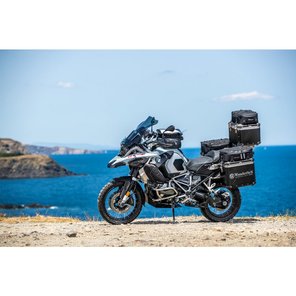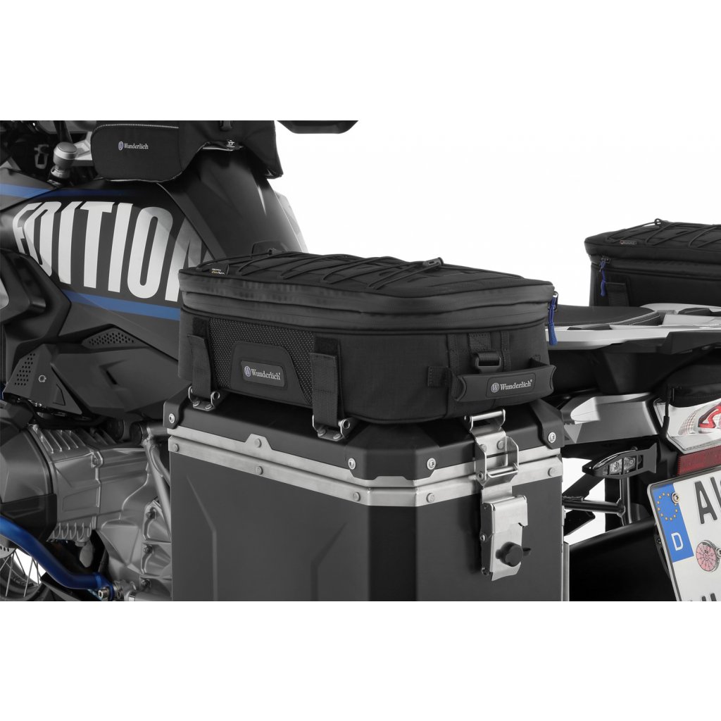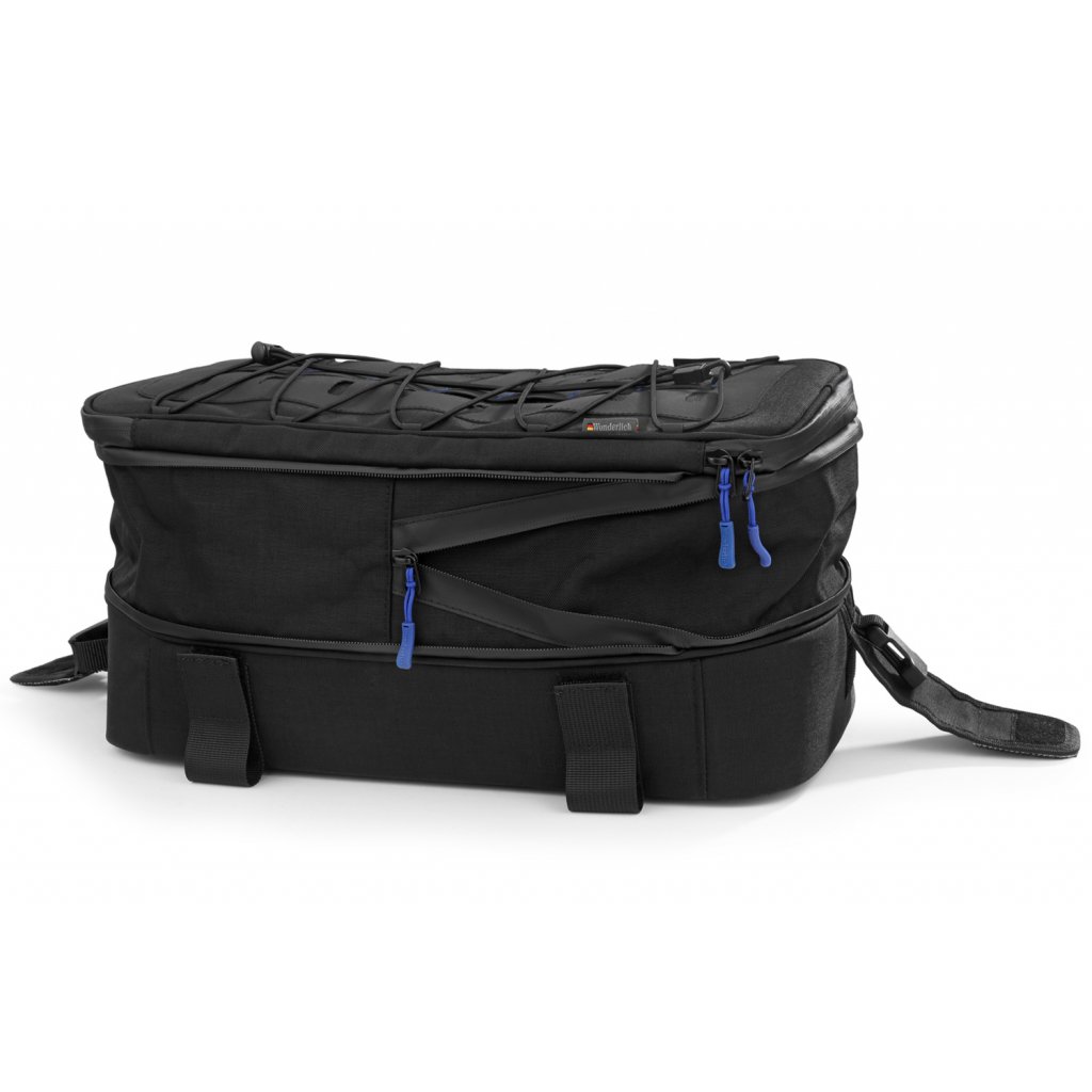 Základna tašky je opatřena celoobvodovou rozměrově stálou vložkou. Proto poskytuje zavazadlům bezpečné držení a ochranu a nevyklápí se ani při vysokých rychlostech. Proto také nezpůsobují žádné kmitavé zvuky související s rychlostí. Navíc nabízejí velmi pohodlnou loketní opěrku pro spolujezdce. Modrá vnitřní podšívka, která je pro Wunderlich typická, tvoří vysoce kontrastní pozadí, na kterém můžete vidět i drobné cestovní náčiní. Zip je vodoodpudivý a má ergonomicky tvarované, snadno uchopitelné modré zipy, které lze snadno ovládat i v rukavicích.