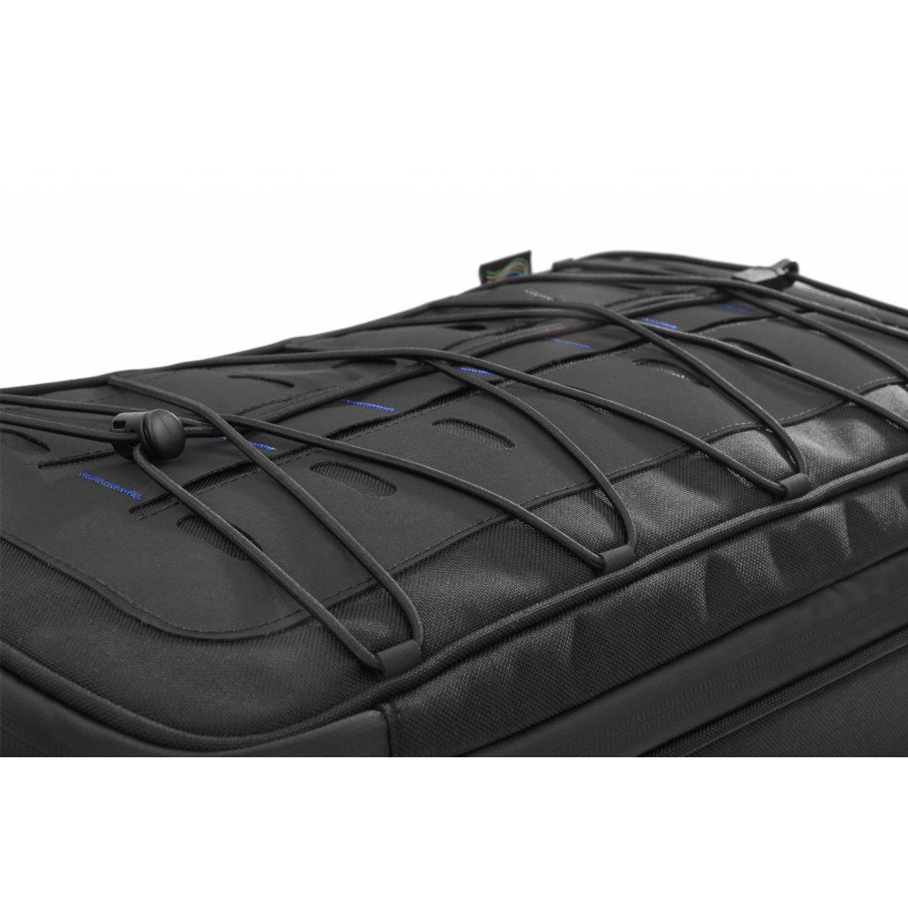 Vršek víka má všestranný montážní systém, srovnatelný s vojenským MOLLE systémem, sestávající z pravidelně uspořádaných oválných otvorů. Další kapsy na příslušenství zde lze snadno individuálně integrovat pomocí poutek. Nastavitelná síť z elastického pásku uspořádaného do cik-caku slouží k rychlému uchycení rukavic apod. Pro přenášení z motocyklu do hotelového pokoje jsme zajistili protiskluzové pohodlné madlo.
