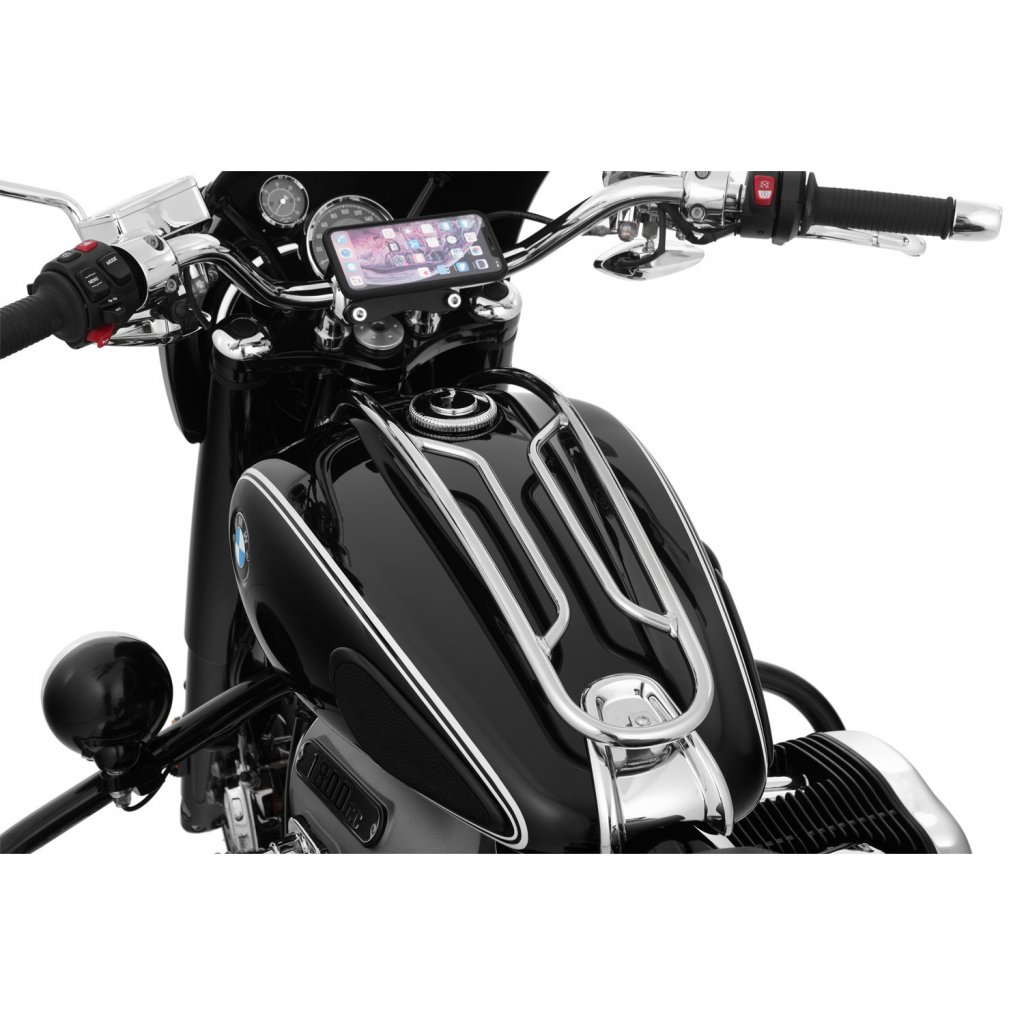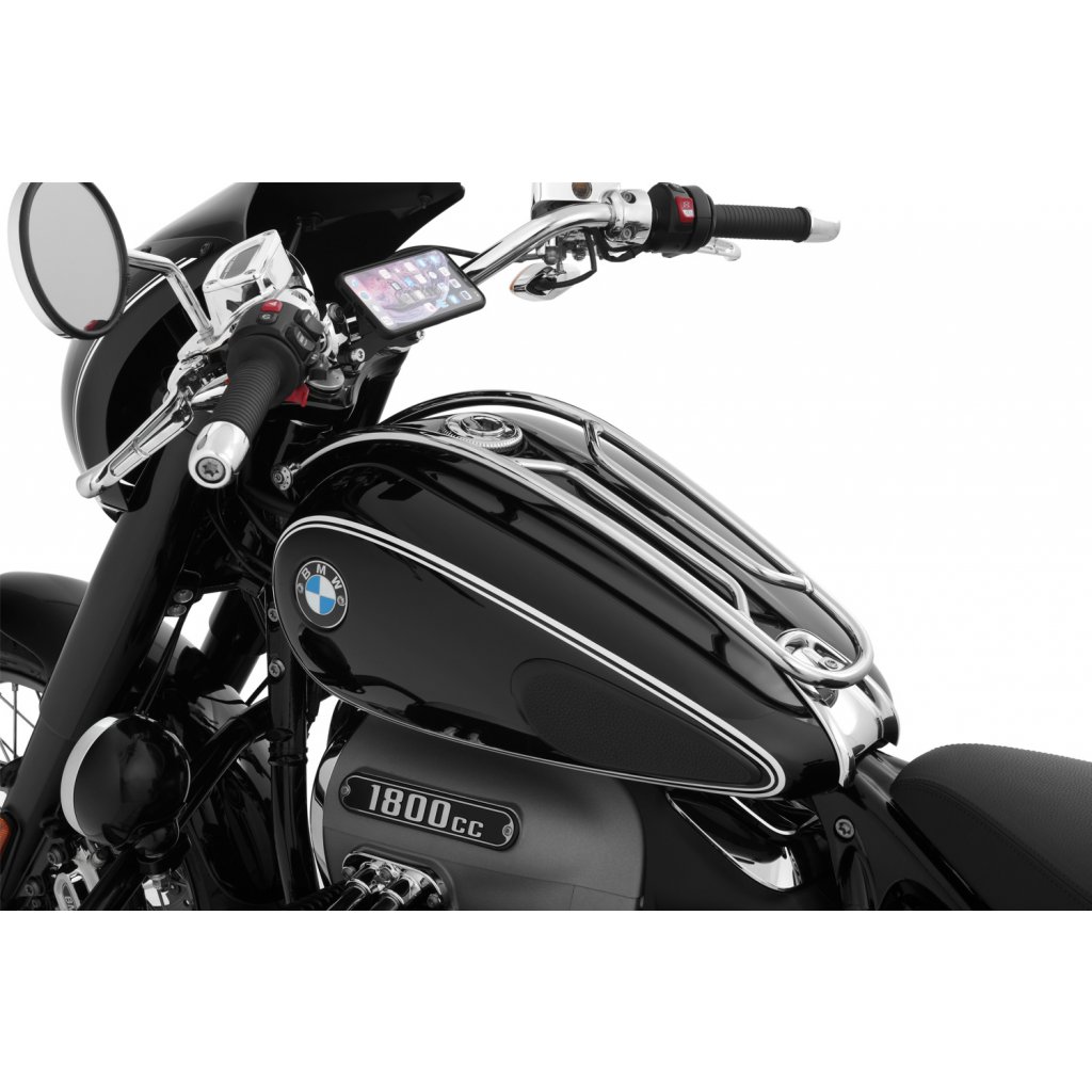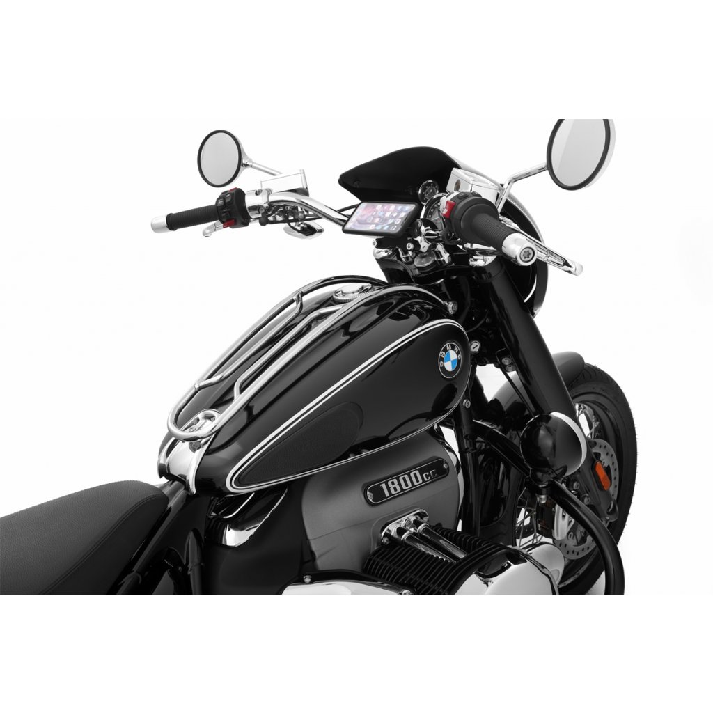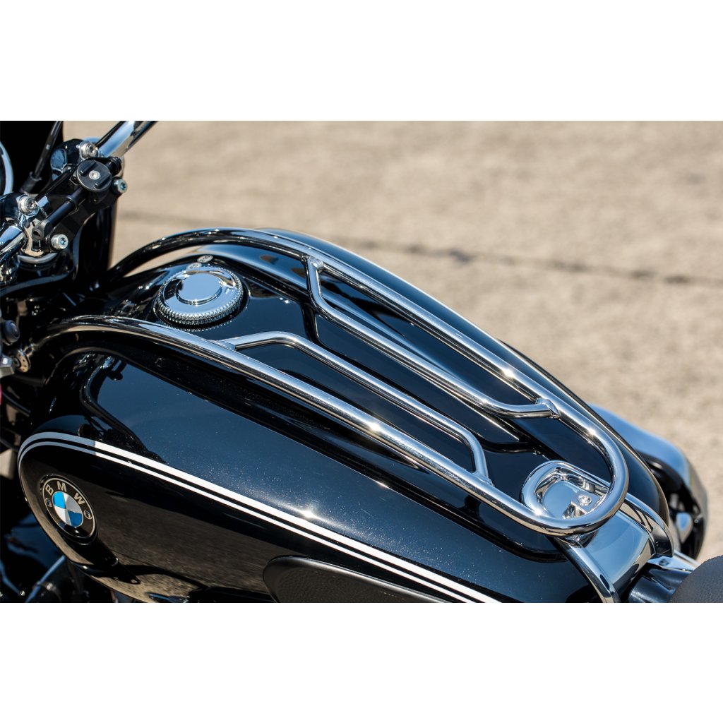 Tento tank rail nasazuje korunu nádrživ tom pravém slova smyslu. Standardní, sytě černá nádrž R 18 vypadá velmi noblesně a klasicky v kombinaci s chromovaným uzávěrem nádrže, panelem nádrže a logem BMW. Trubky svým stylovým funkčním tvarem k sobě pečlivě ladí, svými rozměry a vysoce lesklým, chromovaným povrchem tak umocní krásu černé nádrže. V krátké vzdálenosti od nádrže tvar lišty přesně kopíruje její křivku a šikovně integruje víčko nádrže a chromovaný panel nádrže na straně sedla.