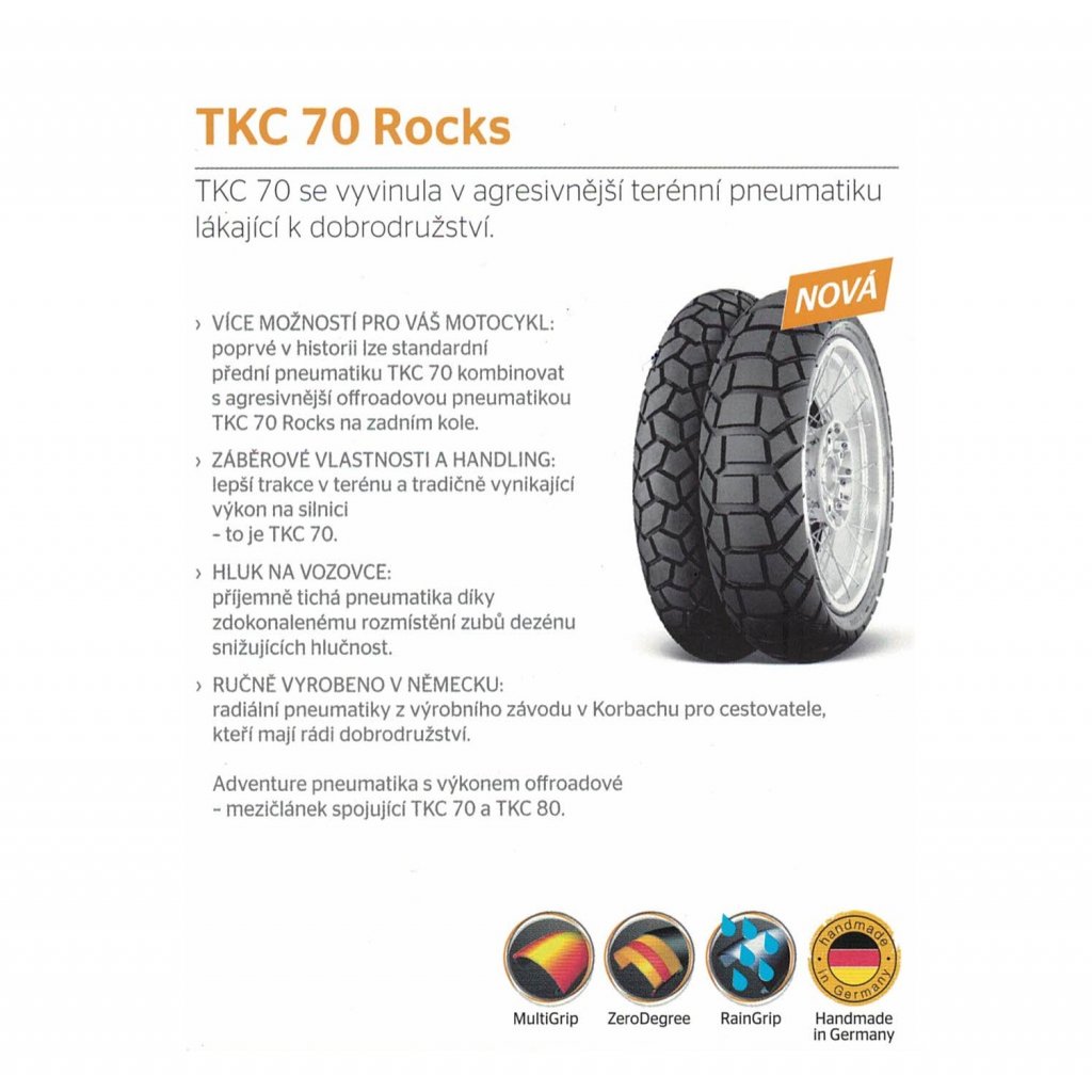 poprvé v historii lze standardní přední pneumatiku TKC 70 kombinovat s agresivnější offroadovou pneumatikou TKC 70 Rocks na zadním kole Lepší trakce v terénu a tradičně vynikající výkon na silnici – to je TKC 70 Příjemně tichá pneumatika díky zdokonalenému rozmístění zubů dezénu snižujících hlučnost Radiální pneumatiky z výrobního závodu v Korbachu pro cestovatele, kteří mají rádi dobrodružství