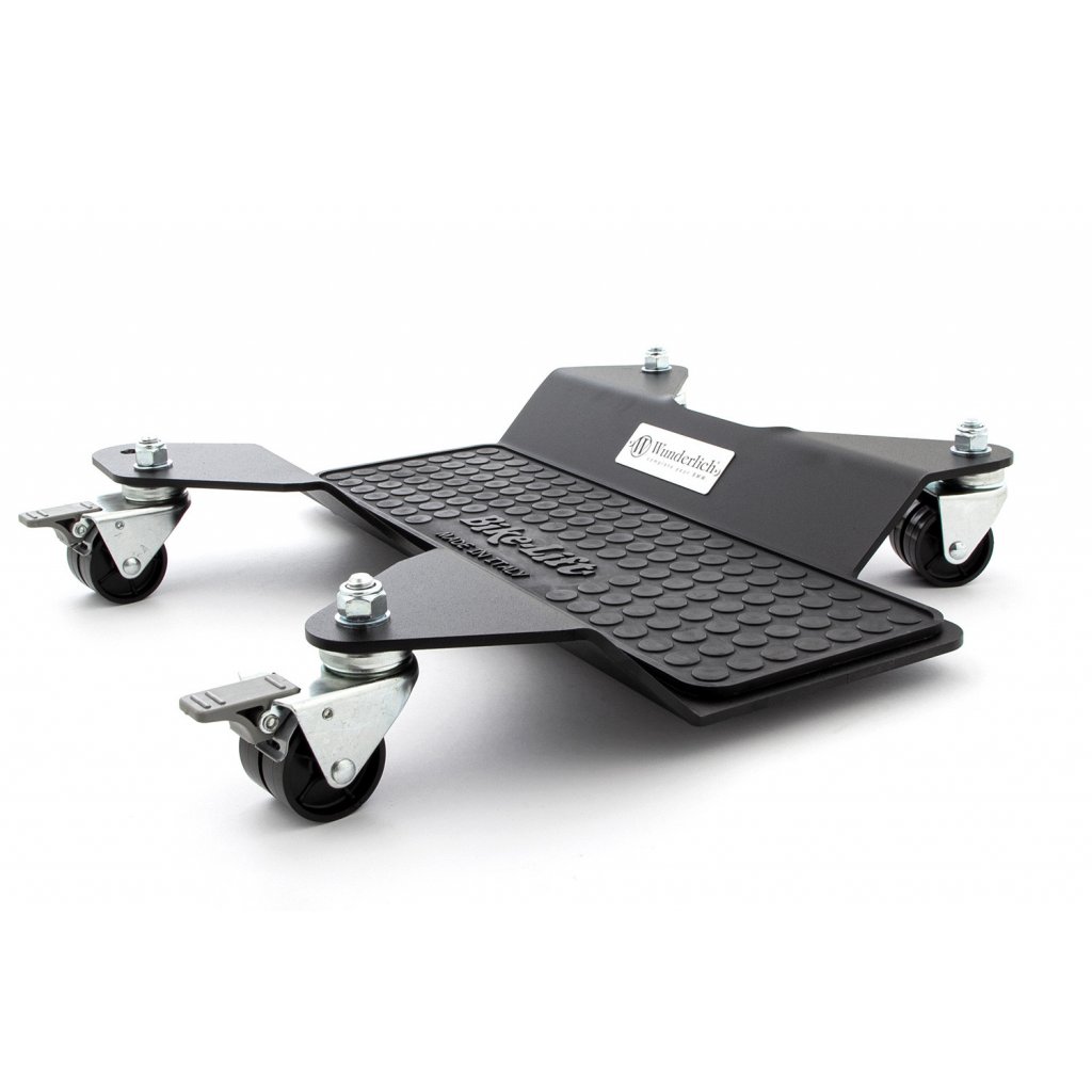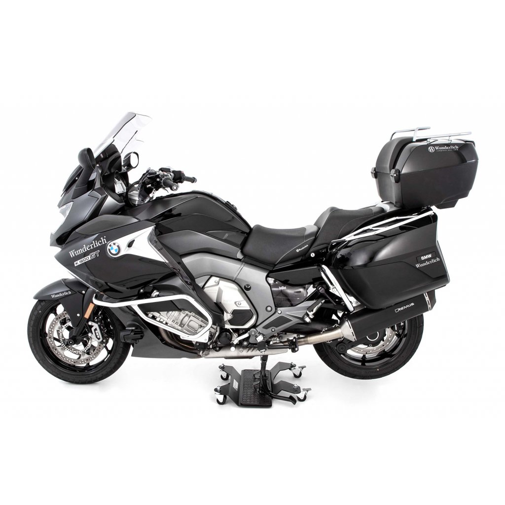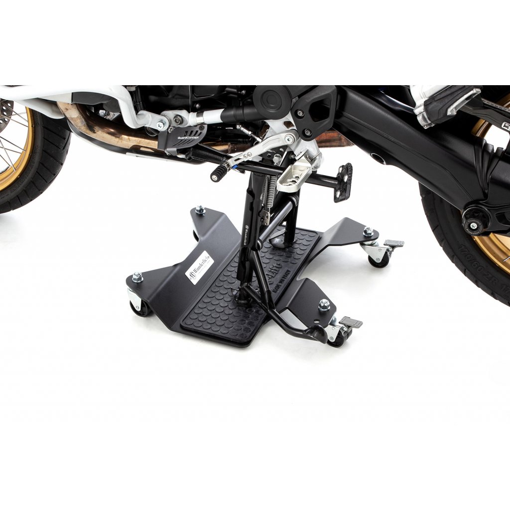 S manévrovací pomůckou Wunderlich můžete snadno manévrovat se zvednutým motocyklem, abyste jej zaparkovali v nejmenší mezeře a ušetřili místo, například při přezimování. Čtyři vysoce kvalitní polyamidová kolečka otočná o 360° chrání podlahovou krytinu a jezdí extrémně snadno. Dvě z nich jsou vybaveny účinnými parkovacími brzdami. Tato pomůcka pro manévrování byla speciálně přizpůsobena hlavním stojanům BMW a byla navržena asymetricky tak, aby nožní páka hlavního stojanu při zvedání nekolidovala s pomůckou pro manévrování a nebránila při zvedání. Pro úsporu námahy při zvedání je lůžko stojanu pomůcky umístěno extrémně nízko a je navrženo tak, aby bylo obzvláště robustní, aby bylo možné pohodlně manévrovat i s plně vybaveným BMW.