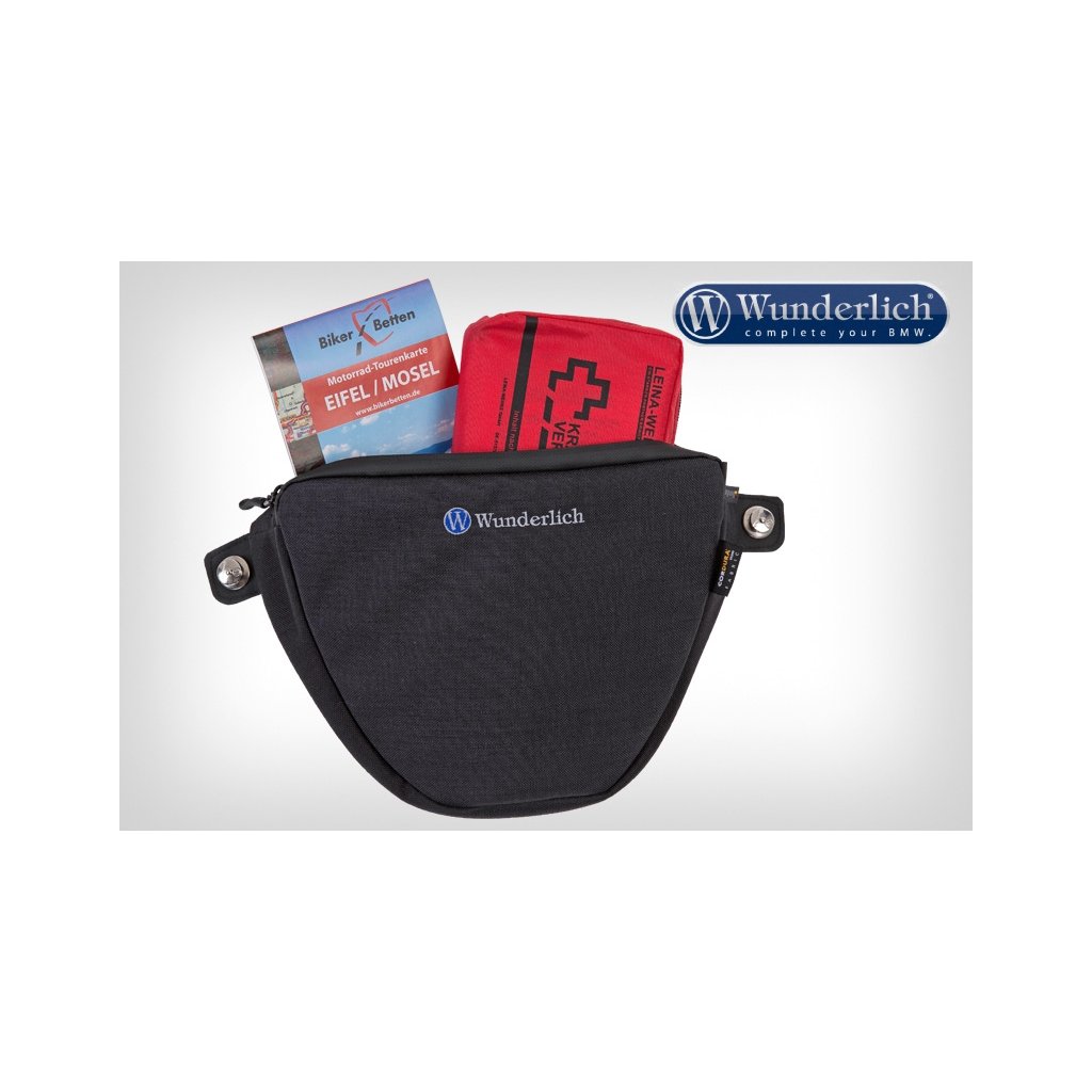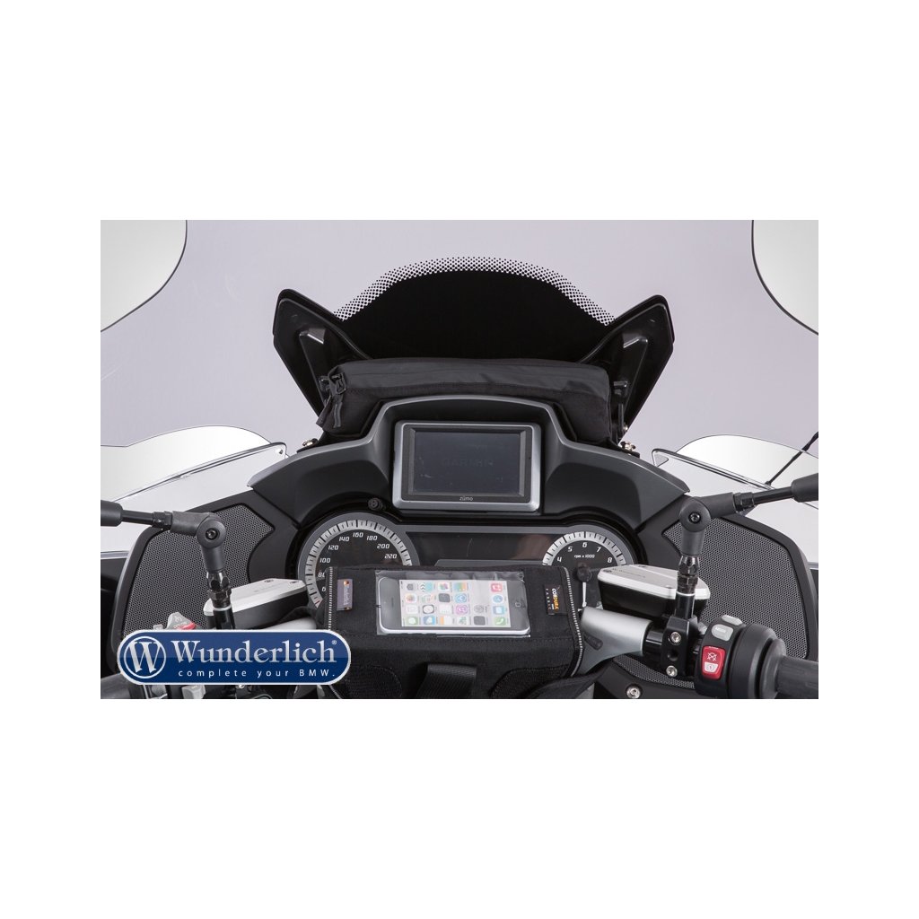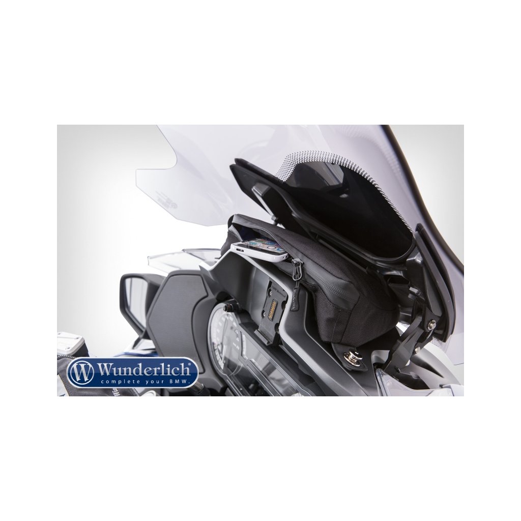 Rafinovaná a přizpůsobená taška Wunderlich naplní nevyužitý prostor mezi štítem a krytem přístrojové desky přesně a nenápadně.