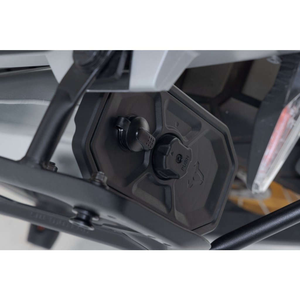TRAX Toolbox lze připevnit na vnitřní nebo vnější stranu bočního nosiče PRO. Polohu lze nastavit na míru pomocí tří upevňovacích bodů, takže krabici lze umístit pod téměř jakýkoli RÁM motocyklu. Utěsněné plastové víko lze připevnit na hlavní pouzdro pomocí jednoduchého otočného zámku.