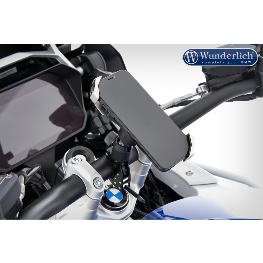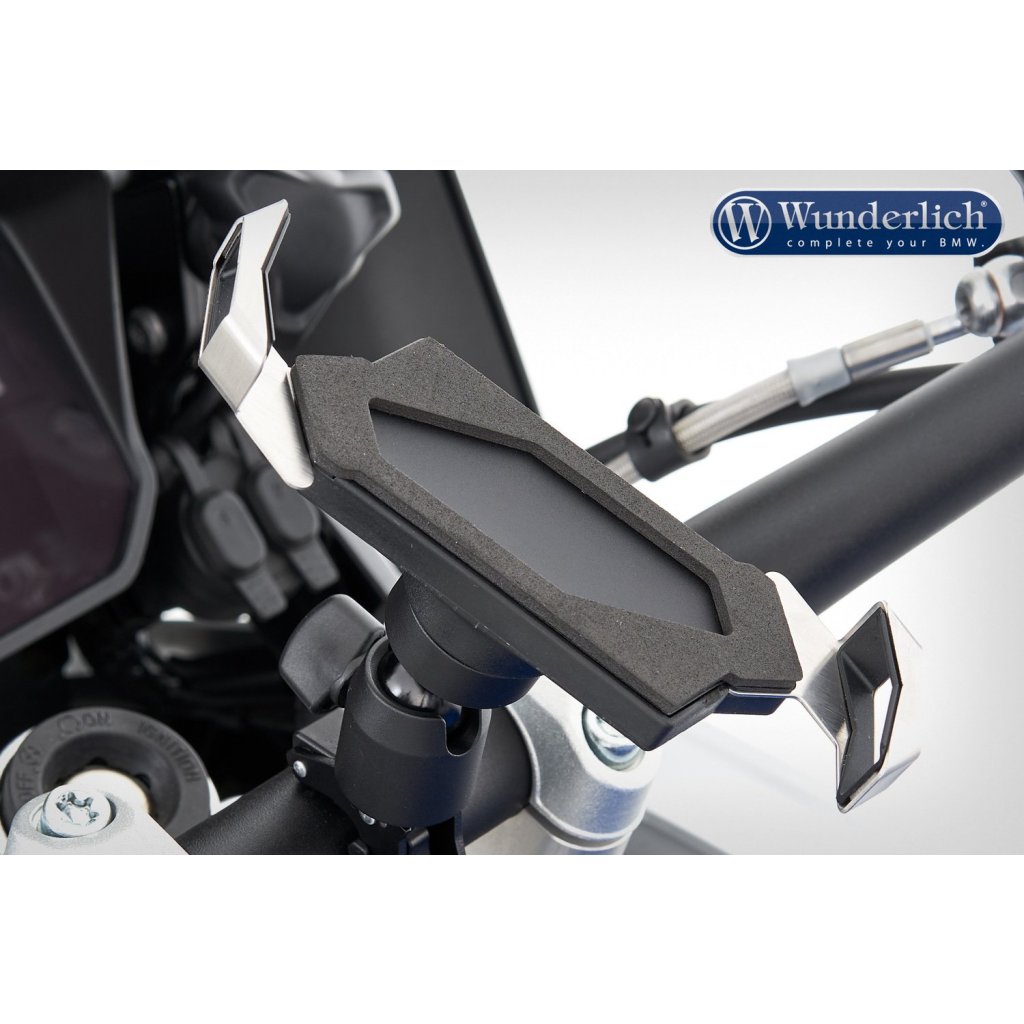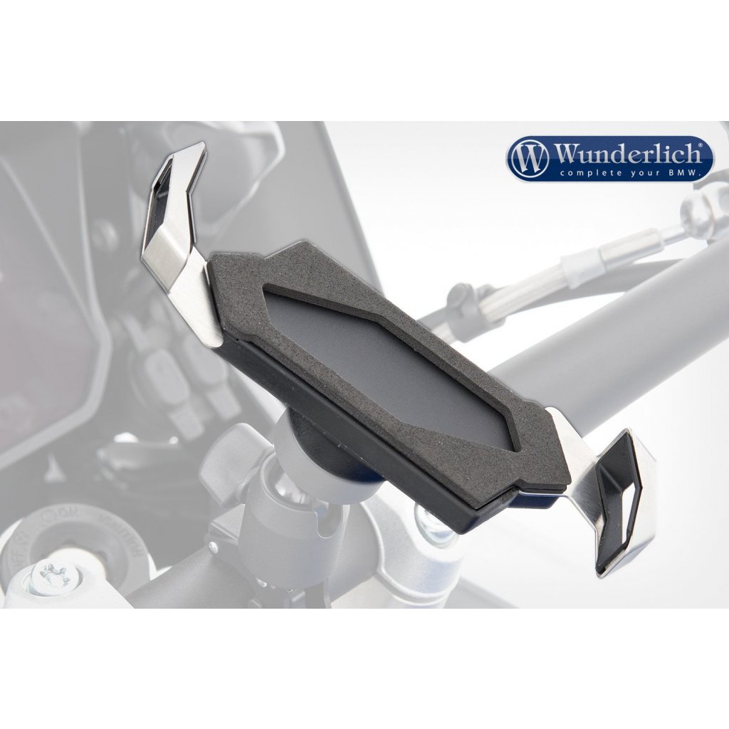 Inovativní, univerzální držák smartphonu pro připevnění řídítek ve spojení s univerzálním držákem »MultiClamp« (45155-002), je plynule nastavitelný a vhodný pro smartphony o délce 135 až 180 mm. Příslušný smartphone je bezpečně držen tvarovým způsobem ve dvou úhlopříčně protilehlých rozích. Samotná nosná plocha je opatřena prvky z pěnové pryže, takže je smartphone chráněn a chráněn před vibracemi. Svorku lze bezpečně zajistit. Držák smartphonu je připojen k univerzální svorce »MultiClamp« pomocí rychloupínacího systému. Úhel (plynulý) a orientaci smartphonu ve formátu na výšku nebo na šířku lze nastavit individuálně.