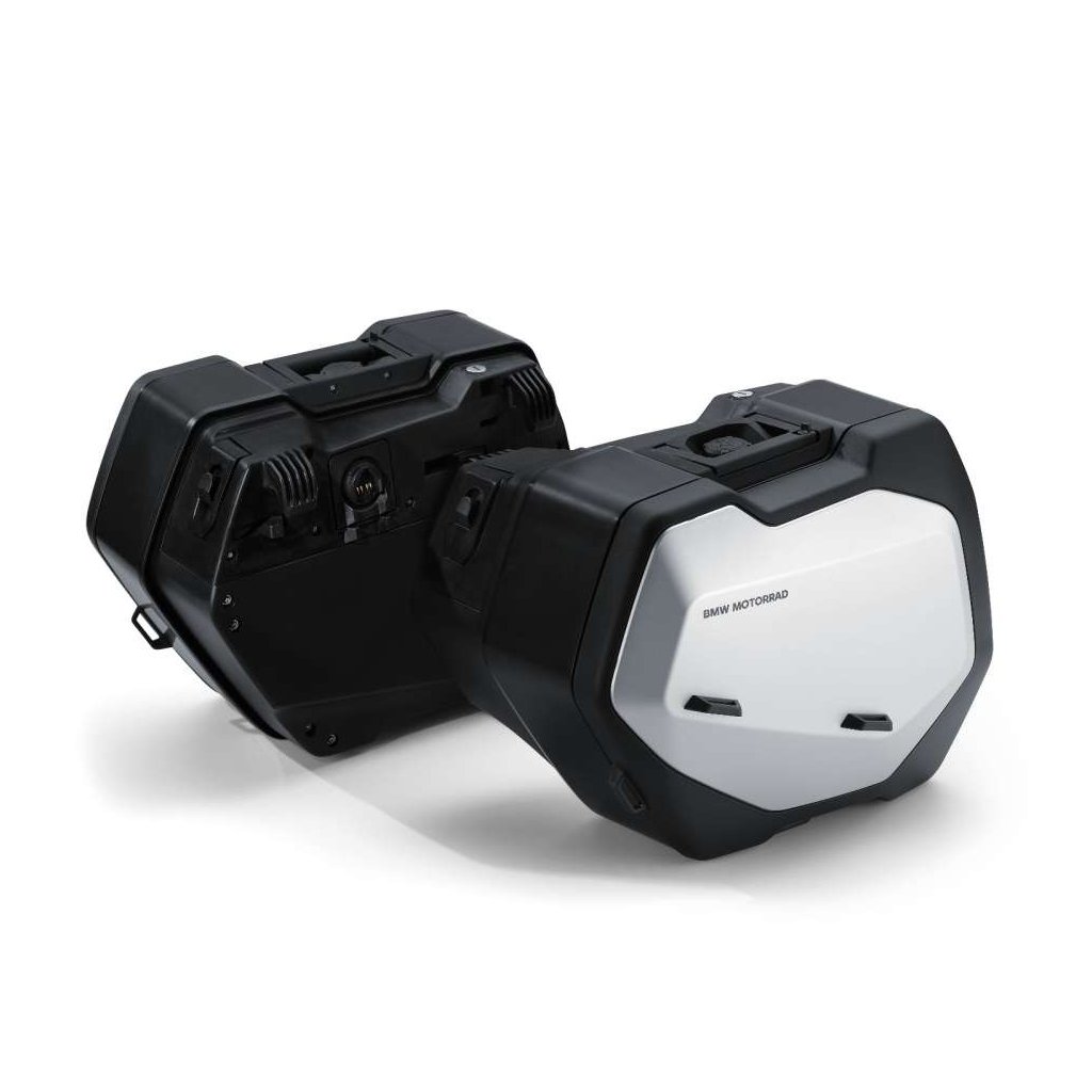 Černé boční kufry Vario zaujmou elektrickými funkcemi jako centrální zamykání nebo vnitřní osvětlení. Nechybí ani USB port pro nabíjení, který se nachází v levém kufru. Kufry mají plynule nastavitelný objem 24 až 30 litrů na pravé straně a 25 až 32 litrů na levé straně. Celková šířka kufrů na motocyklu při nastaveném menším objemu je 90cm.