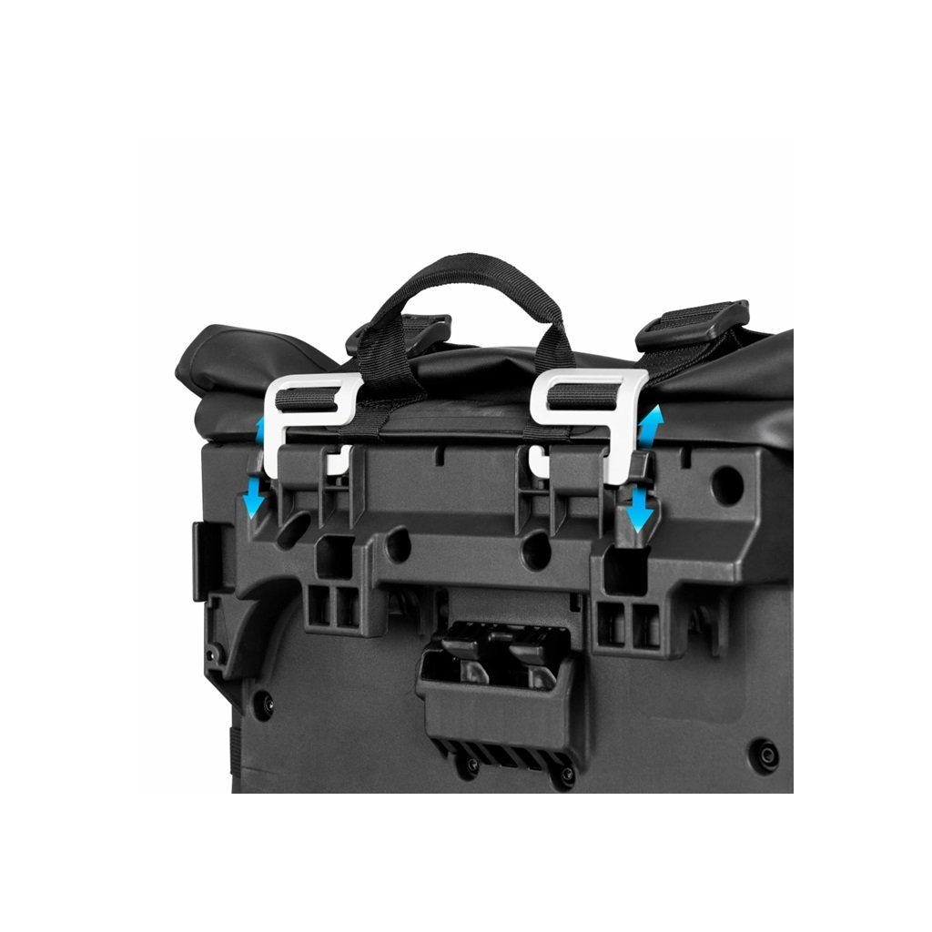 Brašny TR30 vynikají vodotěsností IPX6 a systémem uzavírání „Double Locking System“, uzamyká brašnu k nosiči a zároveň zabraňuje přístupu dovnitř.