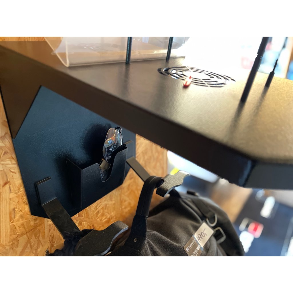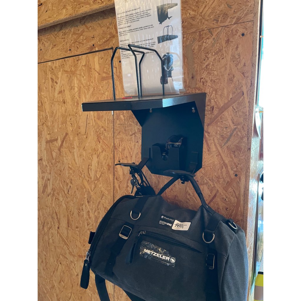 Tento držák je vyvinut za účelem police na helmu a současně zachování pořádku ve vybavení na motorku. Oblečení zavěsíš na obří háky, klíčky doklady a drobnosti frkneš do přihrádky, vše je pohromadě:-)