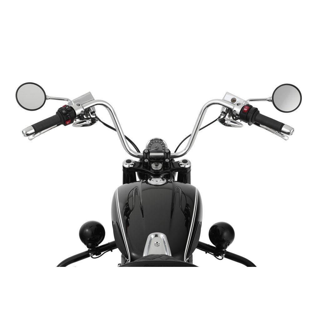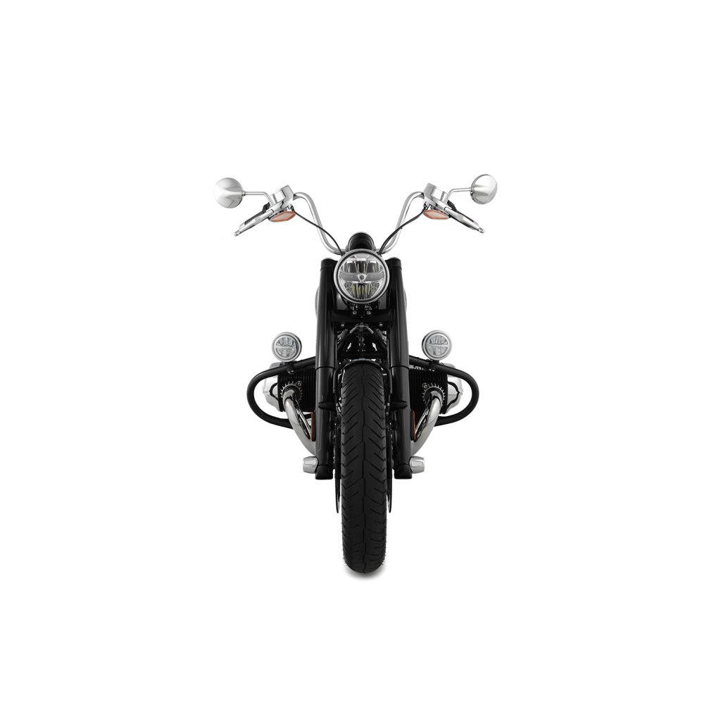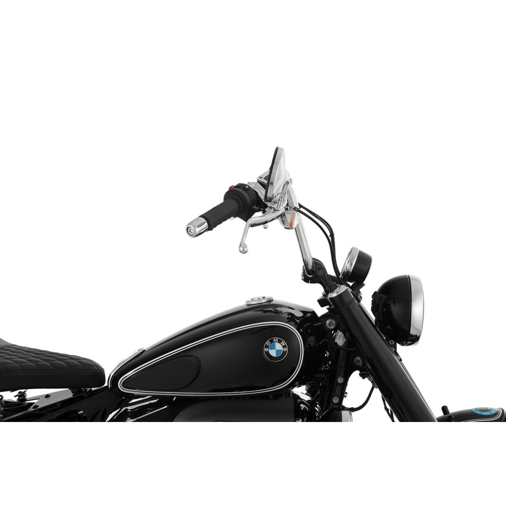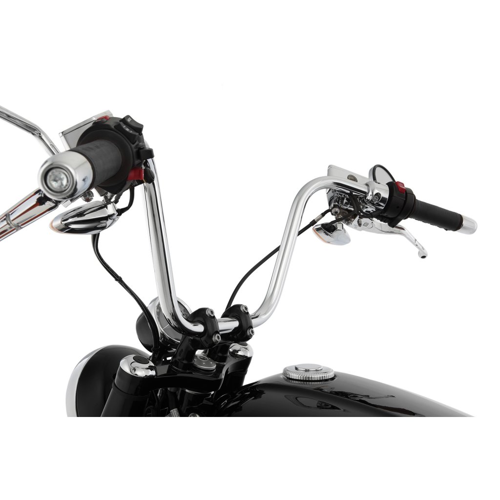 Proto zde představujeme naši verzi stylového závěsu Ape Hanger, který podporuje dokonalé proporce, bezpečnou manipulaci a poskytuje příjemné vzpřímené sezení. Konce řídítek jsou ergonomicky umístěny. To znamená, že máte svůj R 18 vždy pod kontrolou, při jízdě i při manévrování. Výrazná řídítka vyrobená z palců silné, vysoce kvalitní chromované přesné ocelové trubky dodává Big Boxeru zcela nový, jedinečný vzhled. Je vhodné, aby vedení pro přístroje a indikátory bylo možné zasunout do trubek řídítek mimo dohled a učinit je tak neviditelnými pro oči. Potřebné otvory jsou k dispozici. Do konců řídítek lze našroubovat originální koncová závaží řídítek. Vnitřní závity jsou již k dispozici. Kromě samotných řídítek jsou součástí dodávky delší ocelové flex hadice pro spojku a brzdy, prodlužovací kabel pro blinkry a také potřebný montážní materiál.