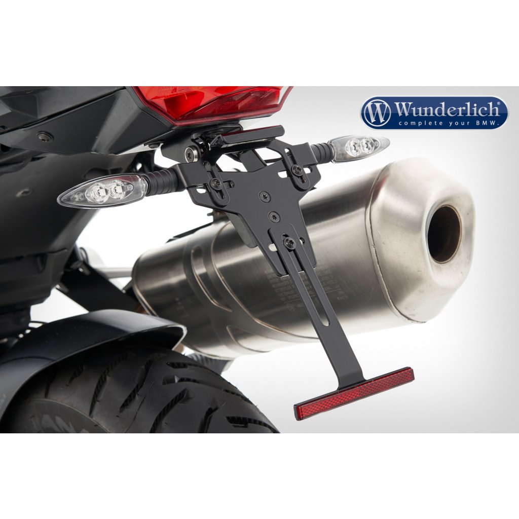 Spodní strana, přesně padnoucí a diskrétní obložení, úhledně uzavírá prostor pod sedadlem, kde je namontována původní zadní část. Je vyroben z hliníku a je černě eloxovaný. Kromě přesného uzavření slouží k zabránění vniknutí vody a nečistot. Slouží také jako základ pro náš štíhlý držák SPZ, vyrobený také z černého eloxovaného hliníku. Držák má diskrétní osvětlení SPZ a na spodním konci má úzký, ale pevný držák SPZ.
