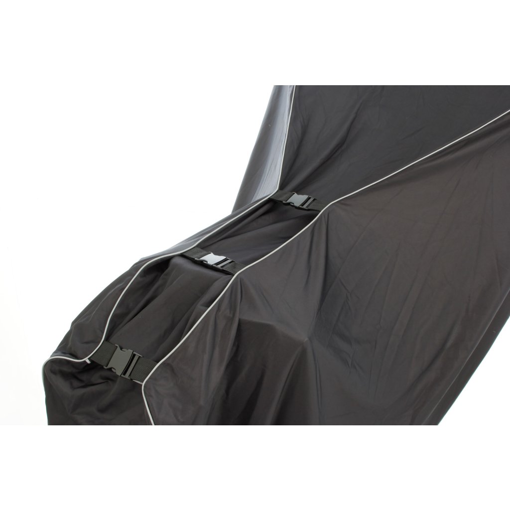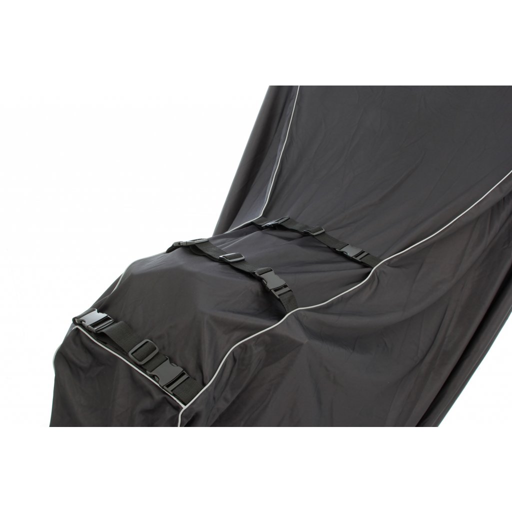 Tři nastavitelné západky umožňují individuální nastavení šířky v zadní části - jsou snadno přístupné na horní straně krytu - takže motocykl lze uložit pod plachtu s brašnou nebo bez ní.