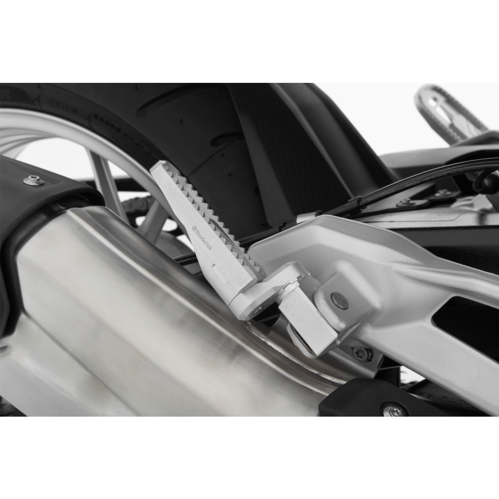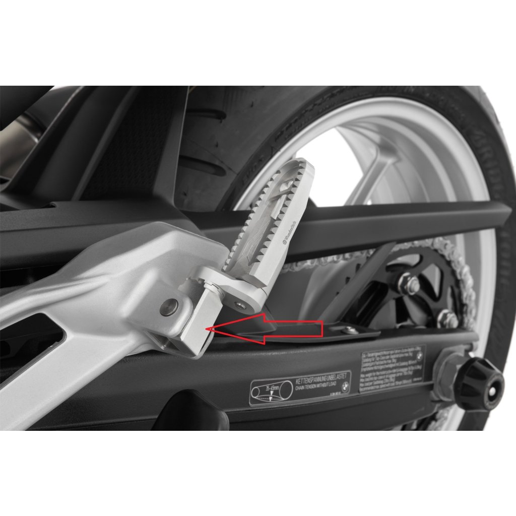 Základem systému je TENTO stříbrný nebo černý Vario kloub, který je vhodný pro příslušný model vozidla, který je namontován na konzole stupačky na motocyklu.