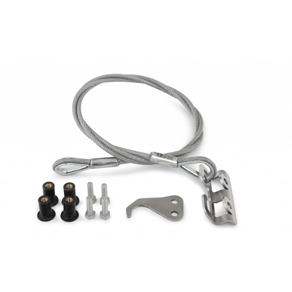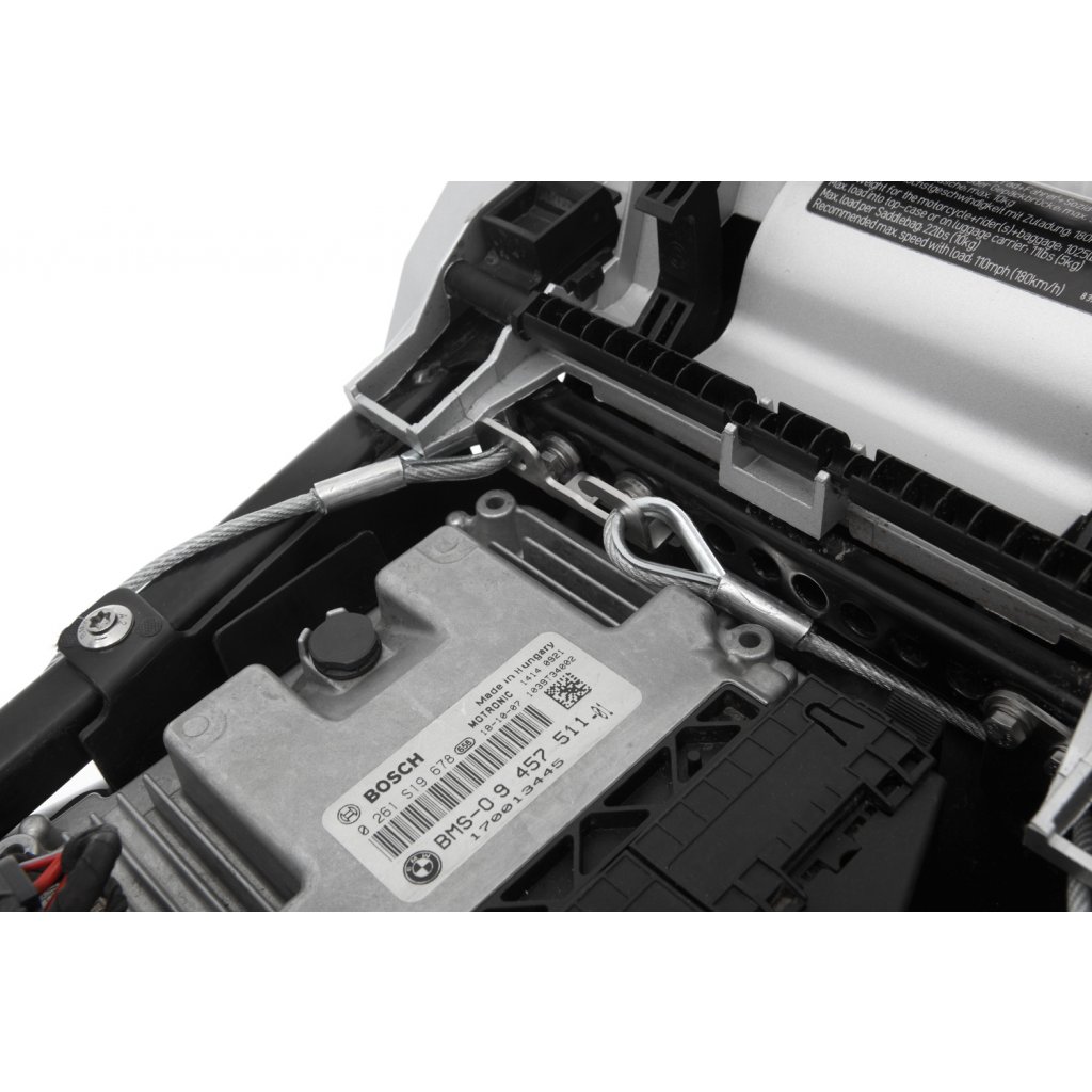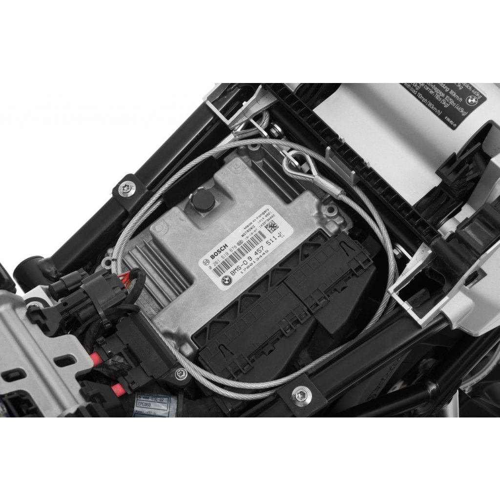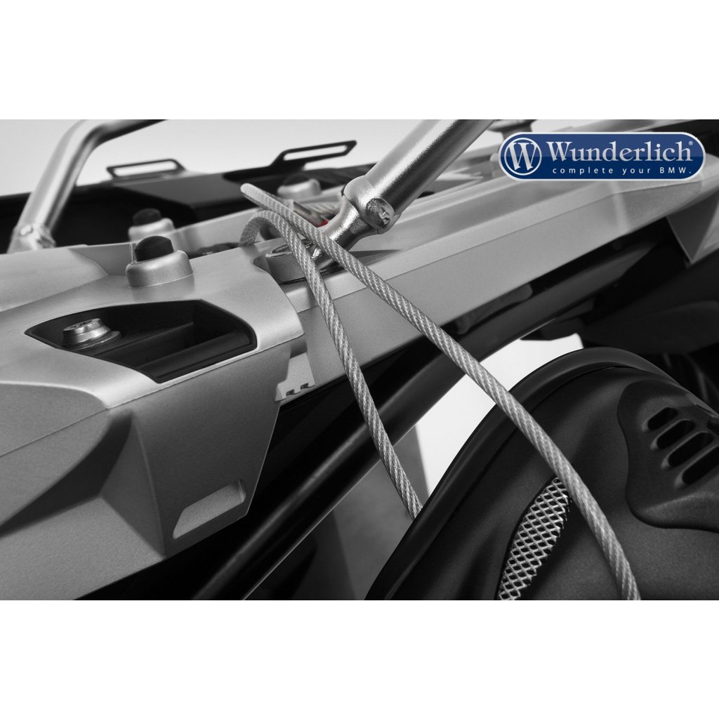 Jemně opláštěné bezpečnostní lano na dvě přilby je jednoduše uloženo, když se nepoužívá na závěsném zařízení. Velmi užitečný produkt. Nic lepšího neexistuje, máme speciálně pro většinu modelů BMW