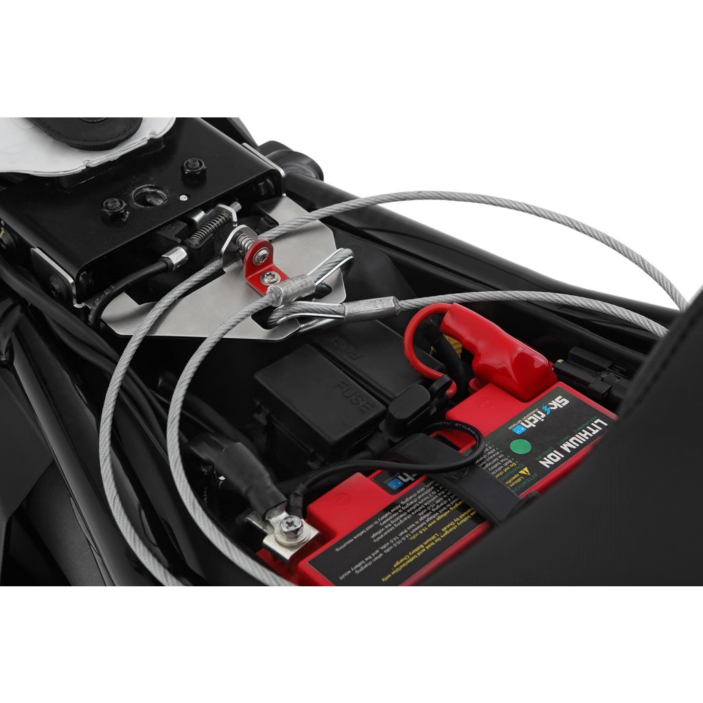 Pravděpodobně nejbezpečnější a snadno ovladatelný zámek přilby. Robustní základ naší hliníkové proti krádežové ochrany je bezpečně upevněn pod sedadlem. Délka kabelu je dimenzována tak, aby zajistila až dvě přilby. Průměr kabelu je 4 mm. Pevné náprstky konců kabelů jsou zavěšeny v závěsném zařízení přídržné základny a bezpečně připevněny pomocí pružinové pojistné tyče. Je také zajištěn namontovaným a uzavřeným sedadlem. To znamená, že není možné otevřít smyčky bez vytažení sedadla. Jsme jediní, kdo nabízí tuto bezpečnostní funkci. Další výhodou je, že není vyžadován žádný další zámek a nemusíte s sebou nosit další klíč. Průhledný, velkoryse dimenzovaný povlak silikonového bezpečnostního kabelu chrání přilby i motocykl před oděrem a poškozením laku. Když se kabel nepoužívá, je uložen pod sedadlem, aby se ušetřilo místo - ale je vždy připraven k snadnému uchopení. Naše ochrana proti krádeži HELM LOCK se snadno používá a velmi pomáhá, takže se bez ní nebudete chtít obejít.