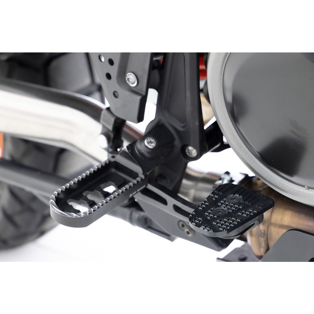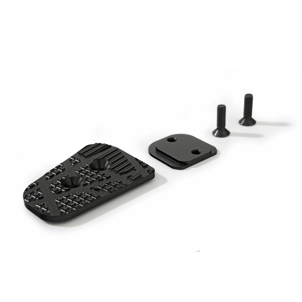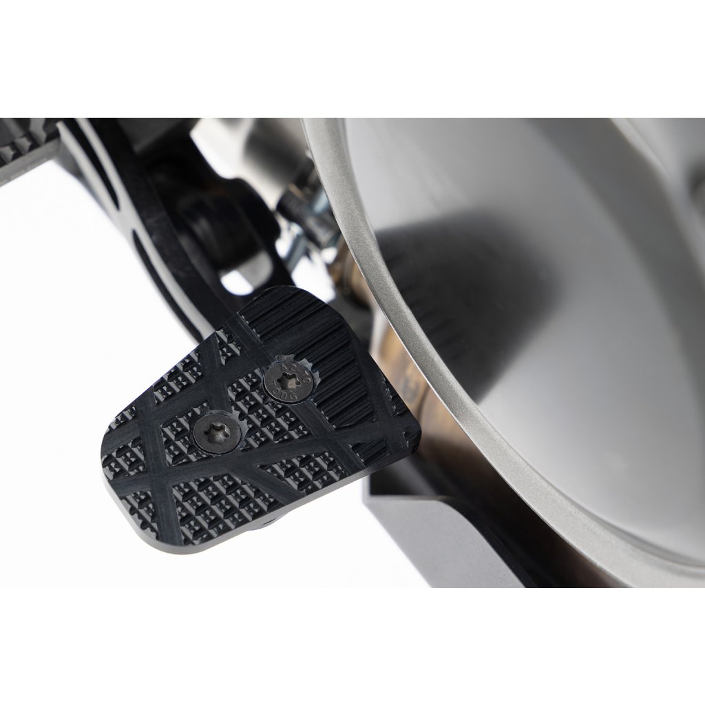 Standardní pedál na páce nožní brzdy je bohužel příliš malý. Hledáte ho znovu a znovu, ale někdy ho trefíte nepřesně a bohužel je dané, že Vám sklouzne špička boty. Sklouznutí, nebo ještě hůře, úplné vynechání pedálu je s tímto zvětšením brzdové páky minulostí. Vysoce kvalitní povrchová úprava zajišťuje, že se jedná o vizuální požitek a protiskluzové, frézované drážky zdůrazňují dobrodružný vzhled a nabízejí nejlepší možnou přilnavost – nejen za mokru nebo v terénu.