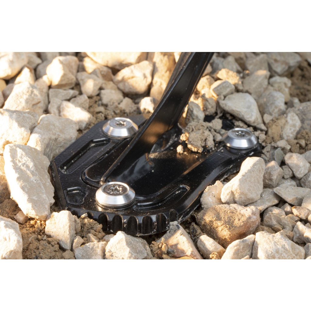 Životní pojištění pro váš Harley: Malá kontaktní plocha původního bočního stojanu znamená, že existuje riziko, že se váš Harley pomalu potopí, často bez povšimnutí, jak na horkém dehtovém povrchu, tak na lehce rozkousané zemi. Přesně vyfrézovaný zvětšovací přístroj, který lze rychle přišroubovat na boční stojan, tuto konstrukční vadu účinně eliminuje. A abychom zajistili, že boční stojan lze snadno vyklopit patou boty, zabudovali jsme také vnější zuby.